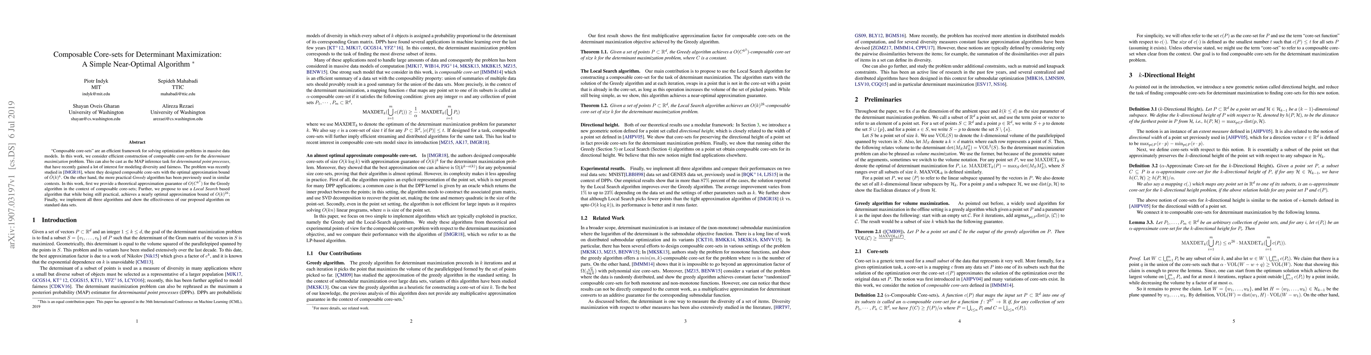 This paper develops efficient algorithms for constructing composable core-sets for determinant maximization, offering a theoretical approximation guarantee for the Greedy algorithm and proposing a Local Search-based method achieving near-optimal bounds. Experimental results demonstrate the effectiveness of the proposed method on standard datasets.