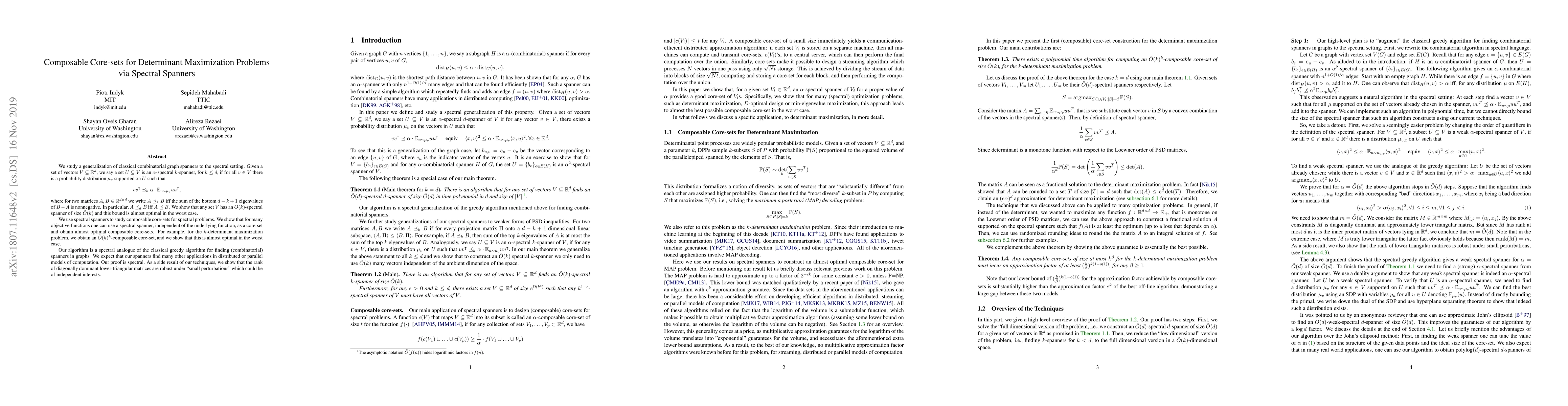 This paper introduces spectral spanners, a generalization of combinatorial graph spanners, to efficiently solve determinant maximization problems. It demonstrates that any set of vectors has an almost optimal spectral spanner of size $\tilde{O}(d)$, and uses these spanners to construct composable core-sets for spectral problems, achieving near-optimality for determinant maximization.