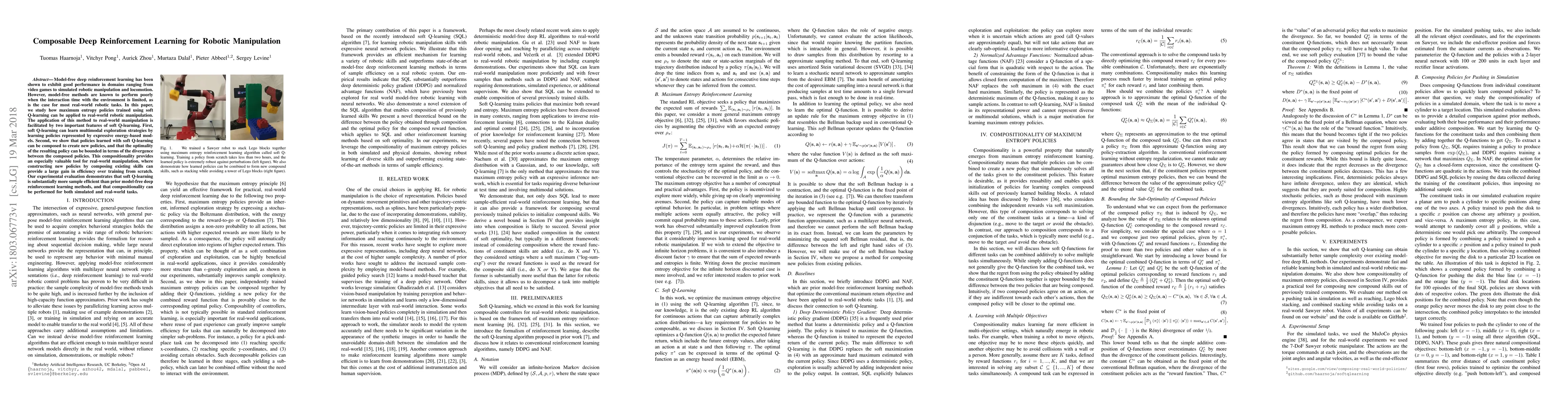 This paper explores the application of maximum entropy policies trained with soft Q-learning to enhance the efficiency of real-world robotic manipulation tasks. It demonstrates that soft Q-learning enables multimodal exploration and policy composition, significantly improving sample efficiency compared to prior model-free methods.
