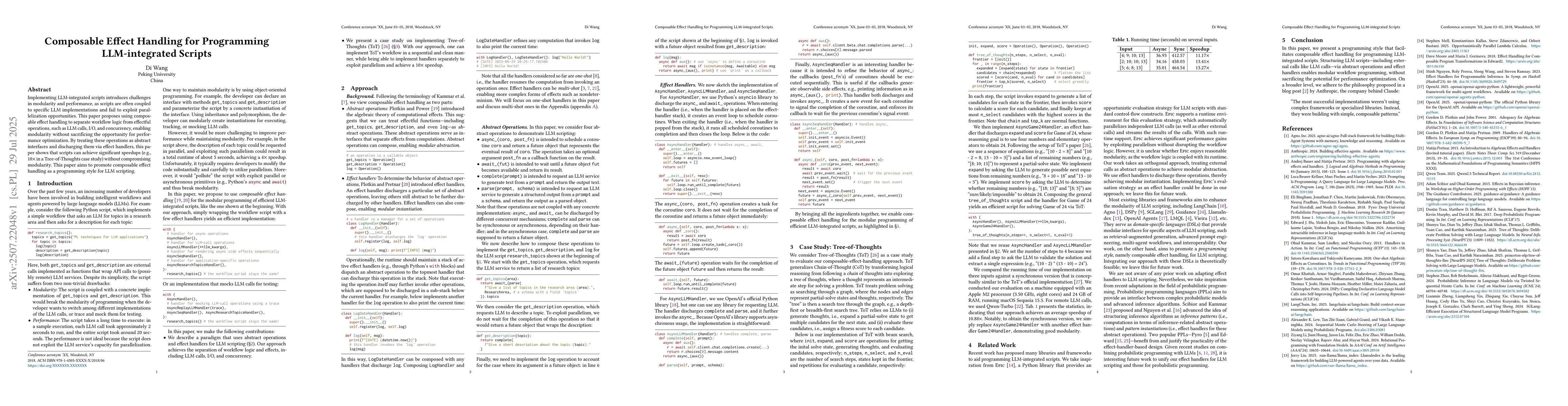 Implementing LLM-integrated scripts introduces challenges in modularity and performance, as scripts are often coupled to specific LLM implementations and fail to exploit parallelization opportunities. This paper proposes using composable effect handling to separate workflow logic from effectful operations, such as LLM calls, I/O, and concurrency, enabling modularity without sacrificing the opportunity for performance optimization. By treating these operations as abstract interfaces and discharging them via effect handlers, this paper shows that scripts can achieve significant speedups (e.g., 10$\times$ in a Tree-of-Thoughts case study) without compromising modularity. This paper aims to promote composable effect handling as a programming style for LLM scripting.