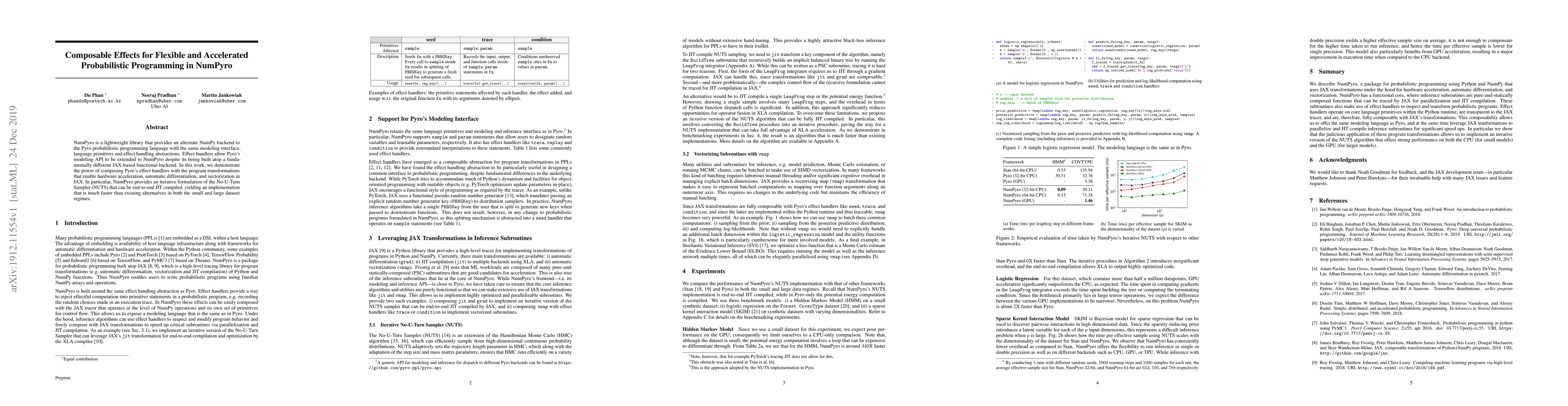 NumPyro is a lightweight library that provides an alternate NumPy backend to the Pyro probabilistic programming language with the same modeling interface, language primitives and effect handling abstractions. Effect handlers allow Pyro's modeling API to be extended to NumPyro despite its being built atop a fundamentally different JAX-based functional backend. In this work, we demonstrate the power of composing Pyro's effect handlers with the program transformations that enable hardware acceleration, automatic differentiation, and vectorization in JAX. In particular, NumPyro provides an iterative formulation of the No-U-Turn Sampler (NUTS) that can be end-to-end JIT compiled, yielding an implementation that is much faster than existing alternatives in both the small and large dataset regimes.