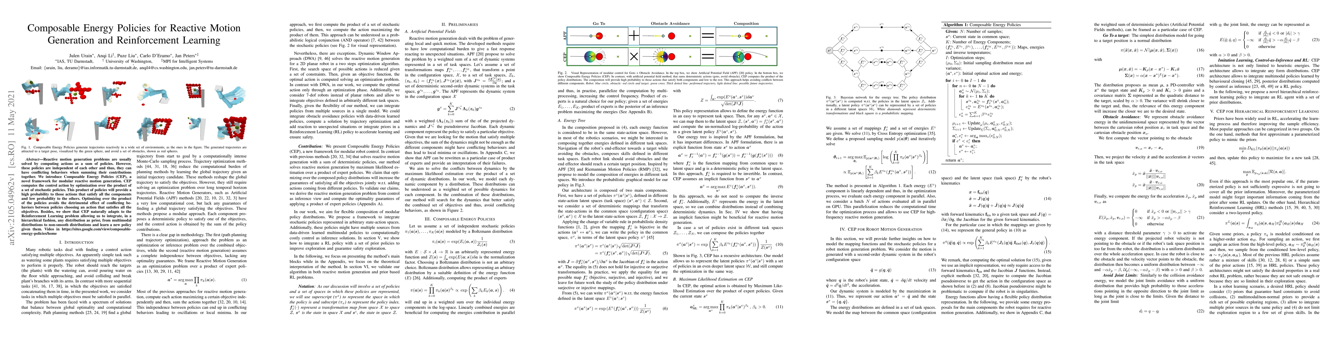 This paper introduces Composable Energy Policies (CEP), a framework for modular reactive motion generation that optimizes the sum of stochastic policies to avoid conflicting behaviors. CEP integrates reinforcement learning by allowing hierarchical integration of various distributions, thus enabling the learning of new policies.