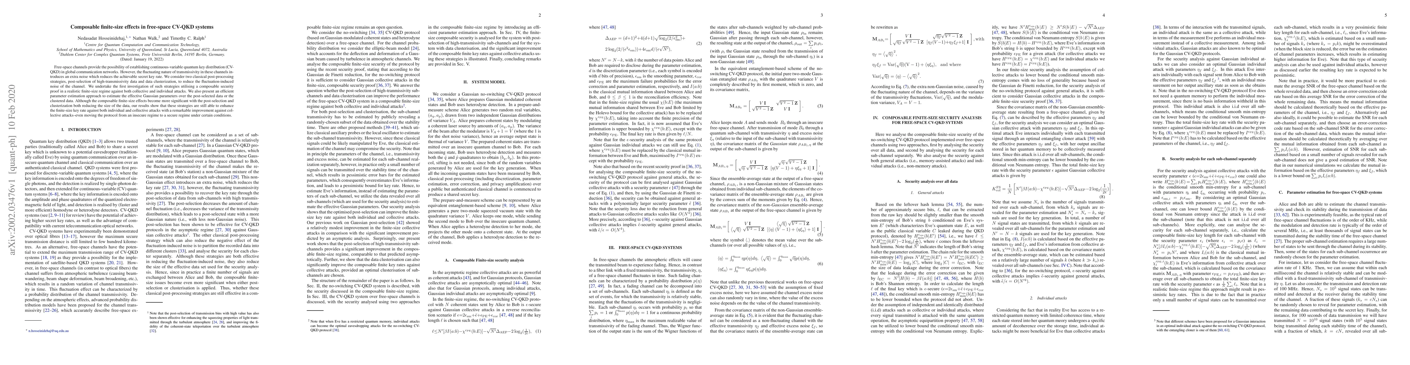 Researchers investigated two strategies to reduce noise in free-space CV-QKD systems: post-selection of high-transmissivity data and data clusterization. These approaches enhanced the finite-size key rate against both individual and collective attacks.