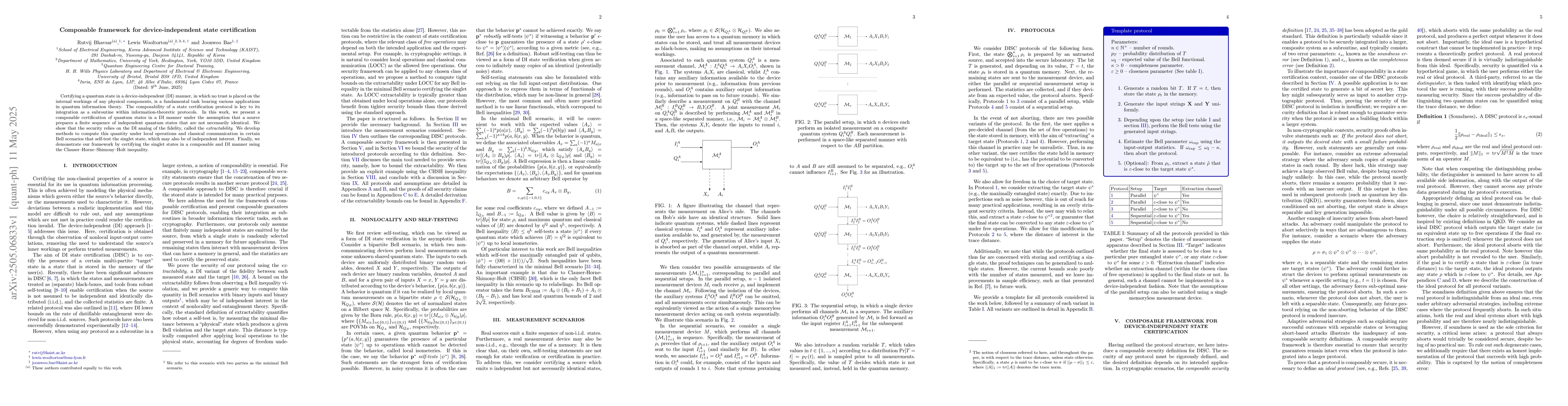 The research presents a composable framework for device-independent (DI) certification of quantum states, relying on the DI analog of fidelity called extractability. It develops methods to compute this quantity under local operations and classical communication in specific Bell scenarios, demonstrating the framework by certifying singlet states using the Clauser-Horne-Shimony-Holt inequality.