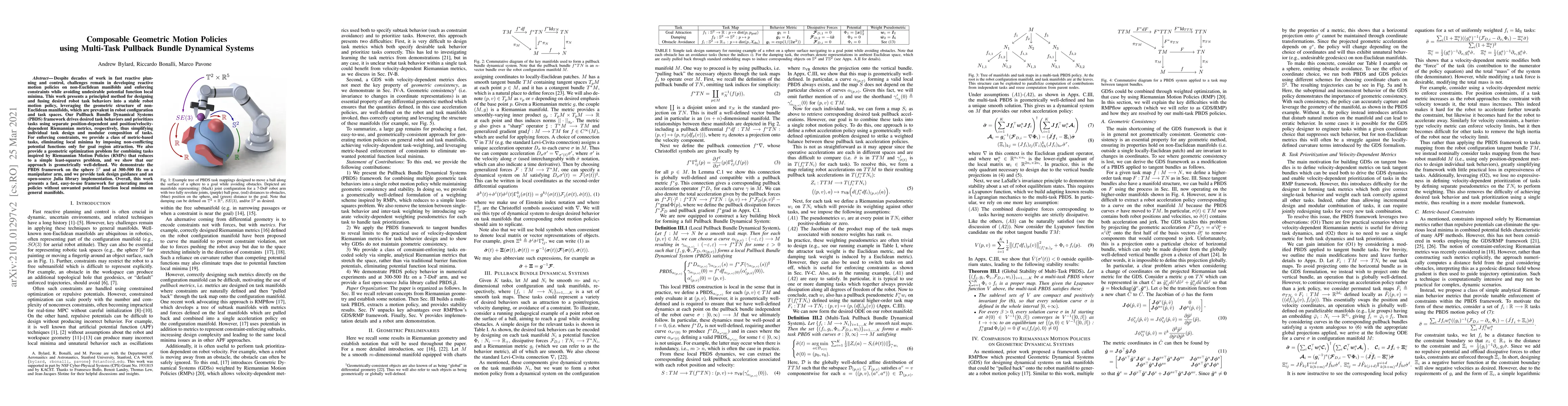 This paper introduces a Pullback Bundle Dynamical Systems (PBDS) framework for designing stable, composable motion policies on non-Euclidean manifolds by leveraging separate Riemannian metrics for task prioritization and constraint enforcement, avoiding local minima through non-conflicting potential functions. Demonstrated on a manipulator arm, the approach provides a modular, geometric optimization method for task composition.