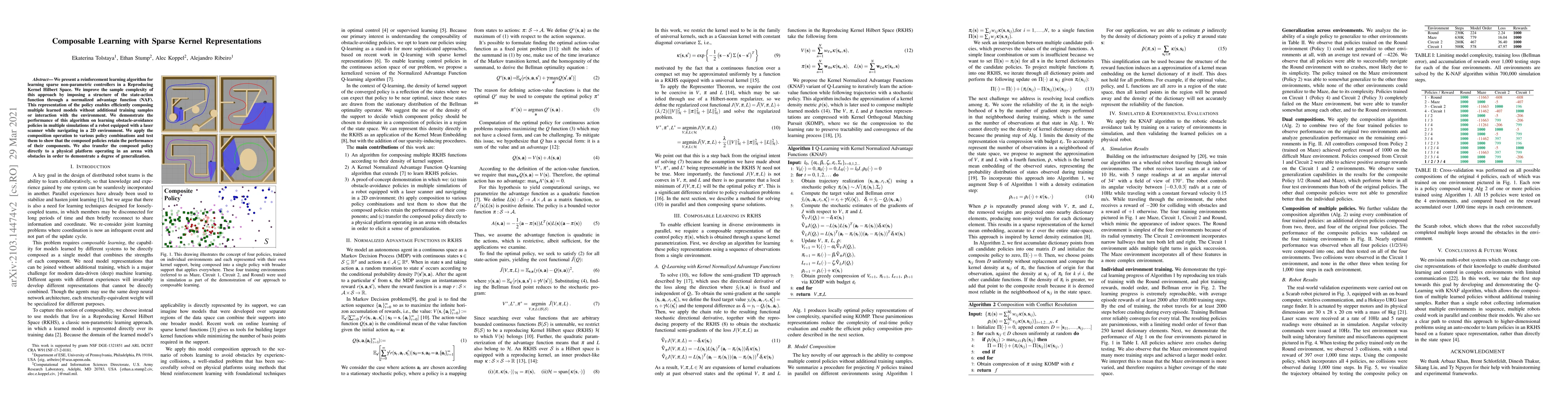 We present a reinforcement learning algorithm for learning sparse non-parametric controllers in a Reproducing Kernel Hilbert Space. We improve the sample complexity of this approach by imposing a structure of the state-action function through a normalized advantage function (NAF). This representation of the policy enables efficiently composing multiple learned models without additional training samples or interaction with the environment. We demonstrate the performance of this algorithm on learning obstacle-avoidance policies in multiple simulations of a robot equipped with a laser scanner while navigating in a 2D environment. We apply the composition operation to various policy combinations and test them to show that the composed policies retain the performance of their components. We also transfer the composed policy directly to a physical platform operating in an arena with obstacles in order to demonstrate a degree of generalization.