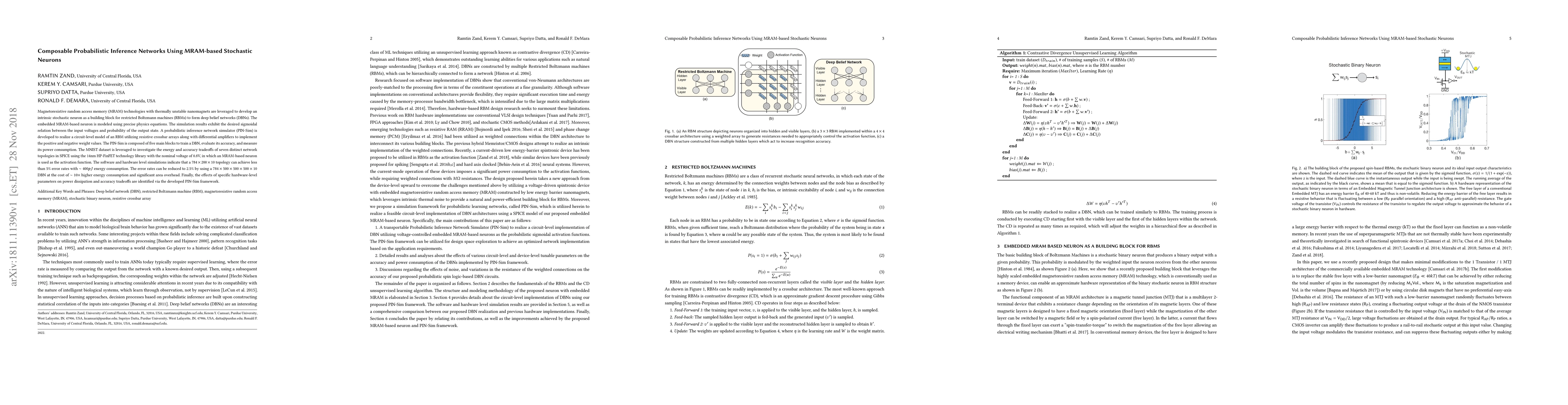 This paper develops MRAM-based stochastic neurons for deep belief networks, demonstrating a circuit-level model using PIN-Sim. The MNIST dataset shows that optimized network topologies can achieve low error rates with significant energy efficiency, though higher accuracy comes at the cost of increased energy and area.