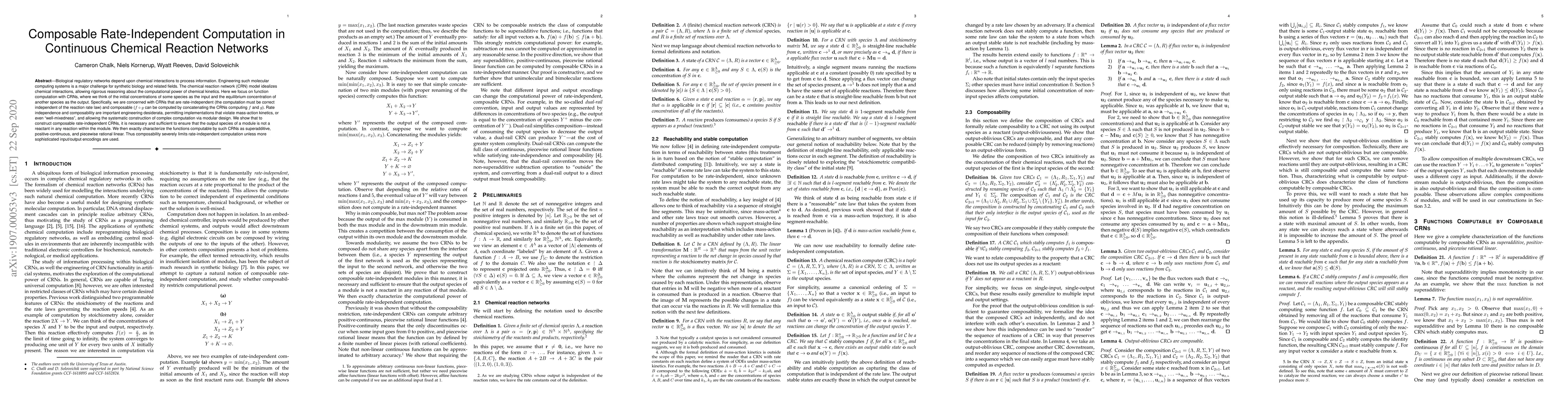 This paper investigates the computational capabilities of continuous chemical reaction networks (CRNs) that are both rate-independent and composable. It establishes that constructing such CRNs requires the output species to not be reactants within the module, and characterizes their computable functions as superadditive, positive-continuous, and piecewise rational linear.