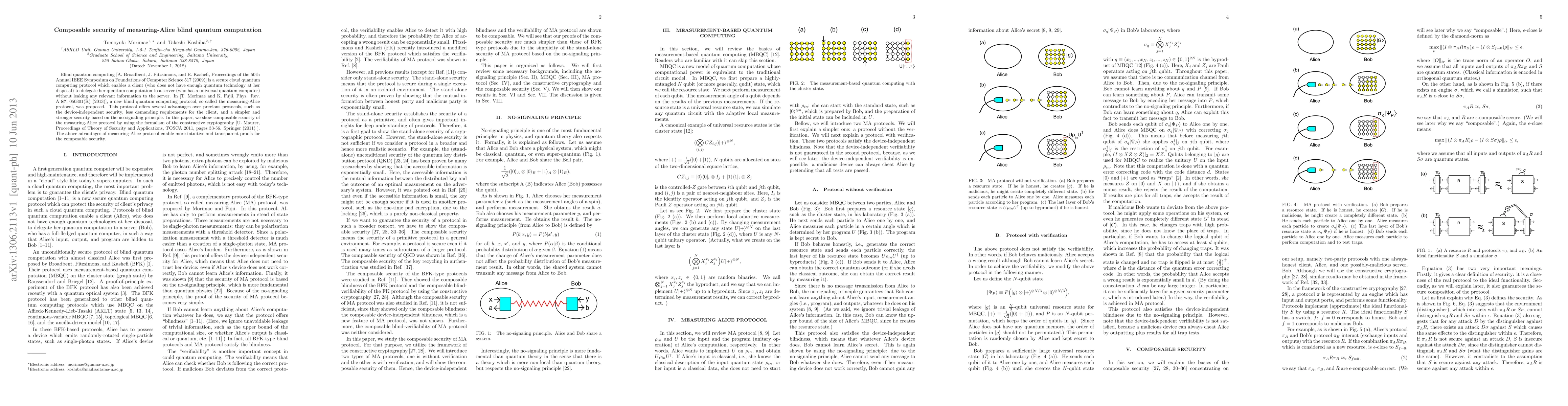 This paper demonstrates the composable security of the measuring-Alice blind quantum computation protocol using constructive cryptography, highlighting its advantages such as device-independent security and simplified security based on the no-signaling principle.