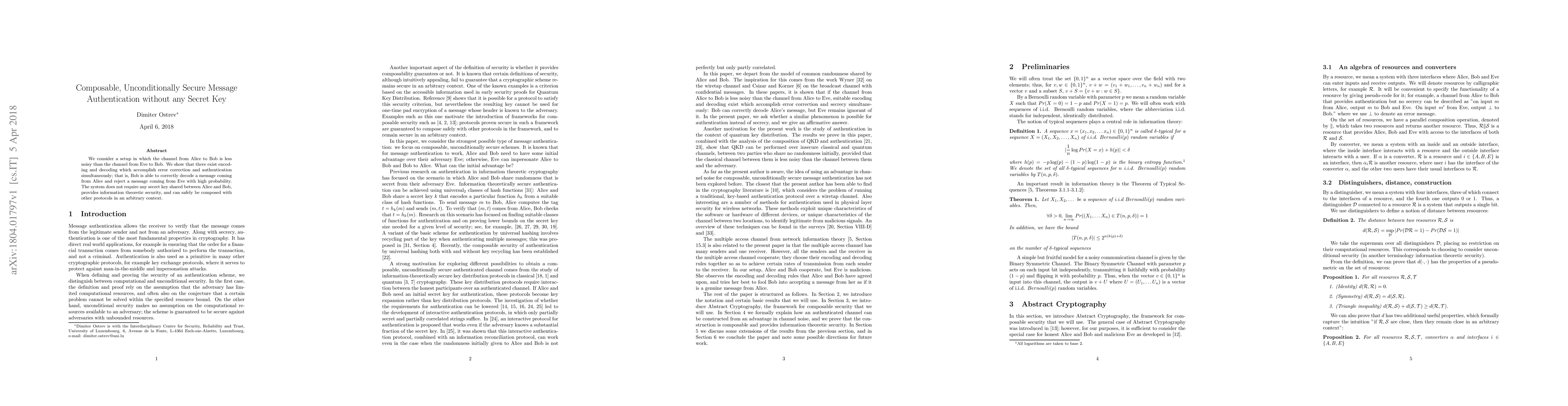 We consider a setup in which the channel from Alice to Bob is less noisy than the channel from Eve to Bob. We show that there exist encoding and decoding which accomplish error correction and authentication simultaneously; that is, Bob is able to correctly decode a message coming from Alice and reject a message coming from Eve with high probability. The system does not require any secret key shared between Alice and Bob, provides information theoretic security, and can safely be composed with other protocols in an arbitrary context.