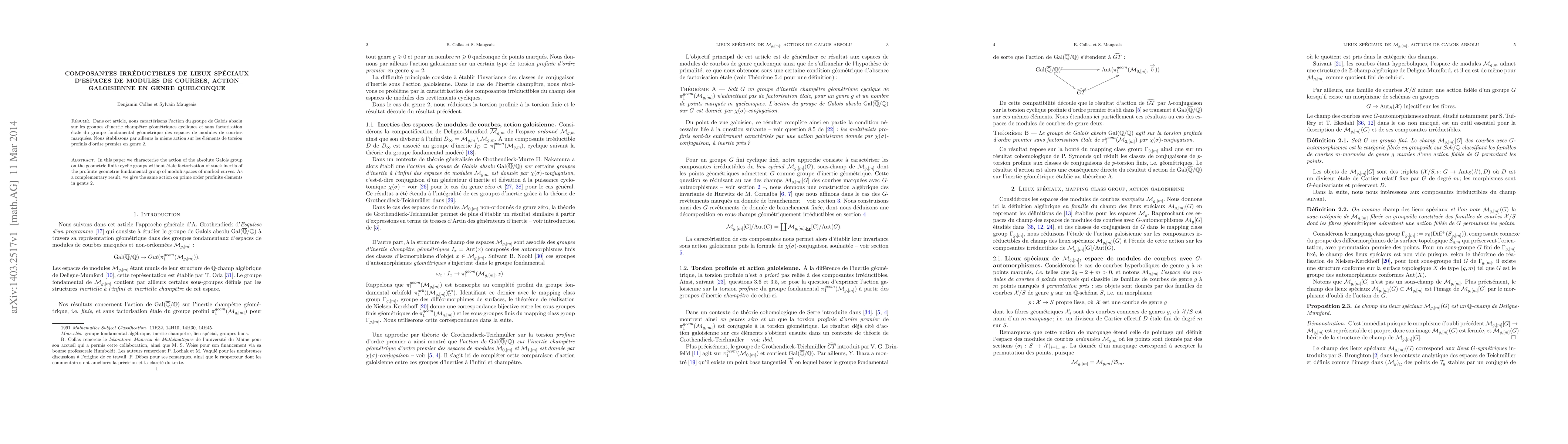 In this paper we characterise the action of the absolute Galois group on the geometric finite cyclic groups without \'etale factorization of stack inertia of the profinite geometric fundamental group of moduli spaces of marked curves. As a complementary result, we give the same action on prime order profinite elements in genus 2.