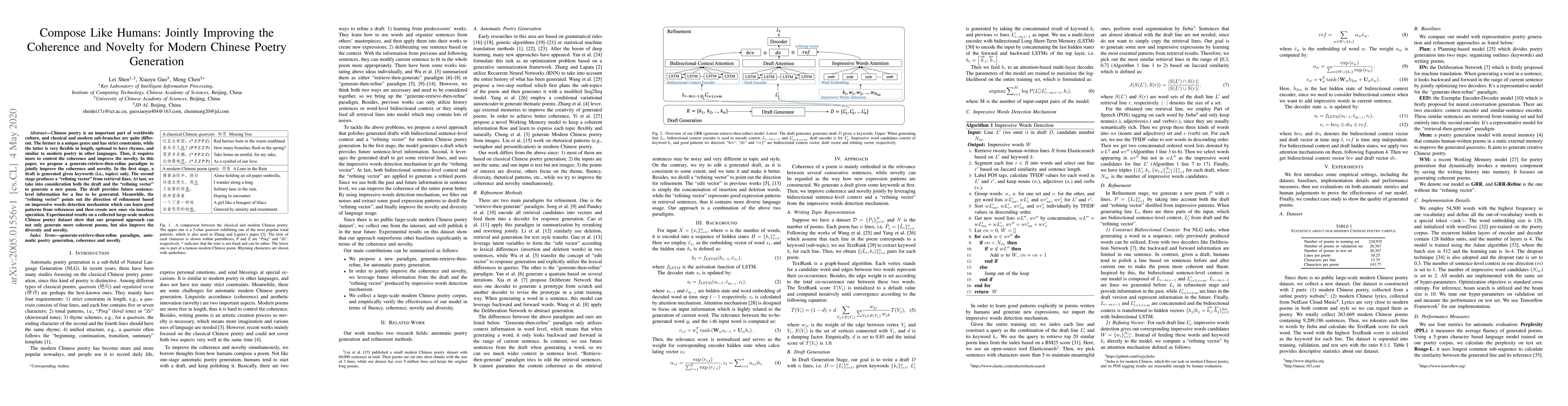 This paper proposes a generate-retrieve-then-refine paradigm to enhance coherence and novelty in modern Chinese poetry generation. The method uses a draft generated from keywords, a refining vector from retrieved lines, and an impressive words detection mechanism to create diverse and coherent poems.
