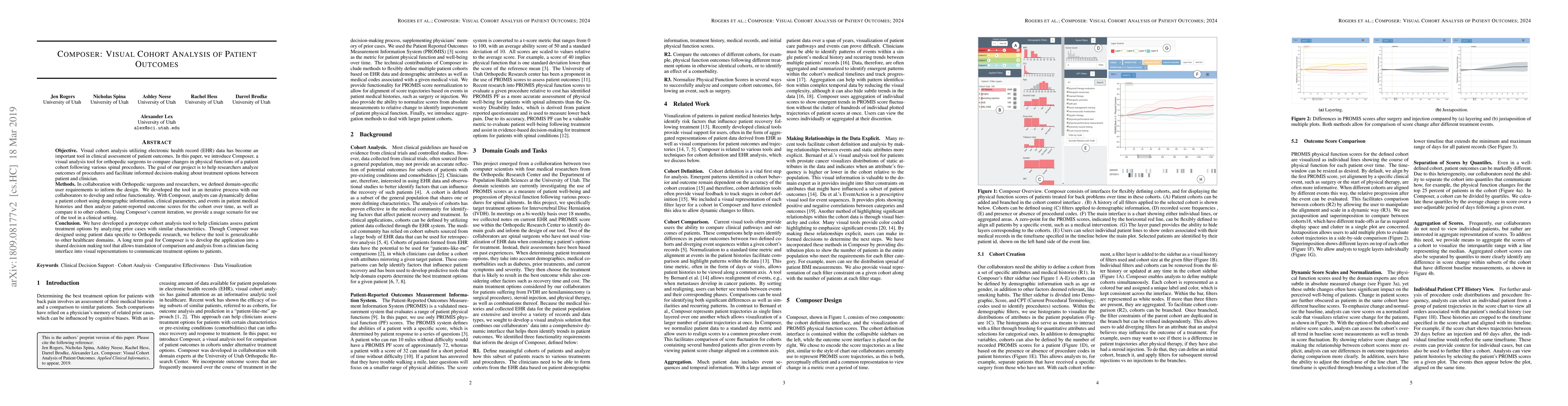 Composer is a visual cohort analysis tool designed for orthopedic surgeons to compare patient outcomes following spinal procedures. It enables dynamic cohort definition and analysis of patient-reported outcomes, aiming to facilitate informed treatment decisions between clinicians and patients.