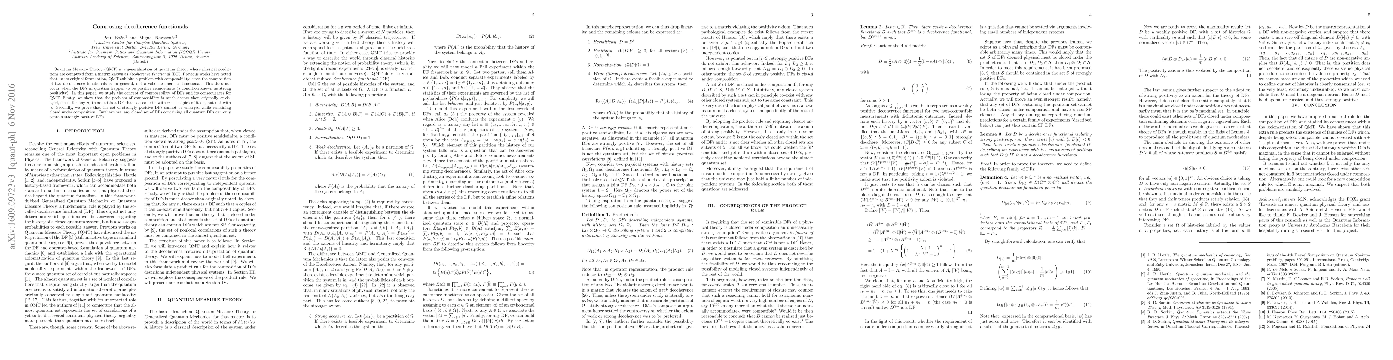 Quantum Measure Theory (QMT) is a generalization of quantum theory where physical predictions are computed from a matrix known as \emph{decoherence functional} (DF). Previous works have noted that, in its original formulation, QMT exhibits a problem with composability, since the composition of two decoherence functionals is, in general, not a valid decoherence functional. This does not occur when the DFs in question happen to be positive semidefinite (a condition known as strong positivity). In this paper, we study the concept of composability of DFs and its consequences for QMT. Firstly, we show that the problem of composability is much deeper than originally envisaged, since, for any $n$, there exists a DF that can co-exist with $n-1$ copies of itself, but not with $n$. Secondly, we prove that the set of strongly positive DFs cannot be enlarged while remaining closed under composition. Furthermore, any closed set of DFs containing all quantum DFs can only contain strongly positive DFs.
