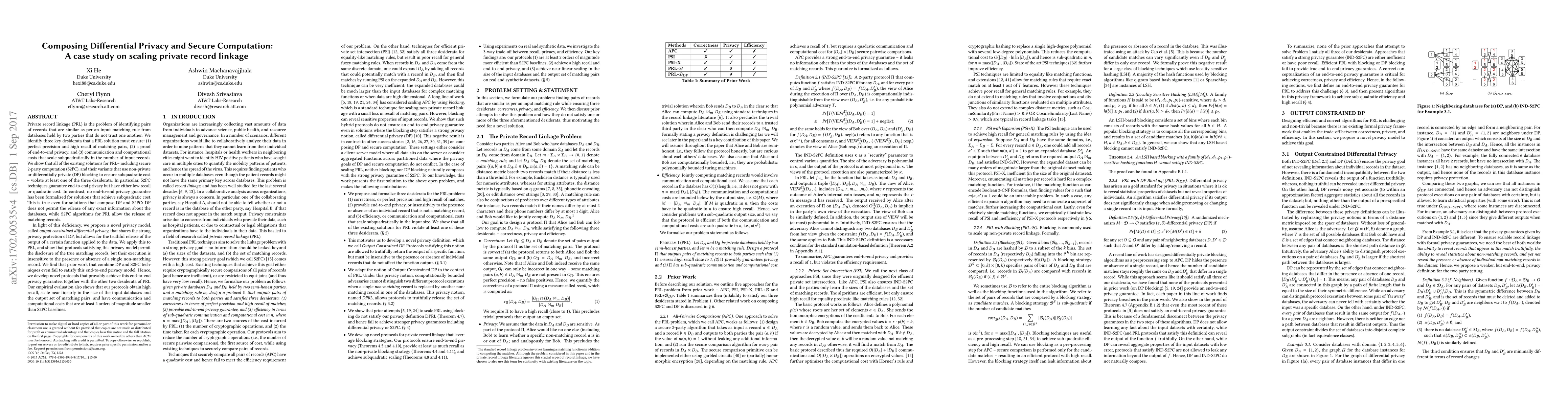 This paper proposes a novel privacy model called output constrained differential privacy to address the challenge of private record linkage (PRL) while ensuring high precision, recall, and subquadratic scalability. It identifies limitations in existing solutions, which either lack privacy or fail to meet cost and recall requirements, and develops new protocols that achieve end-to-end privacy, high recall, and subquadratic computational costs.