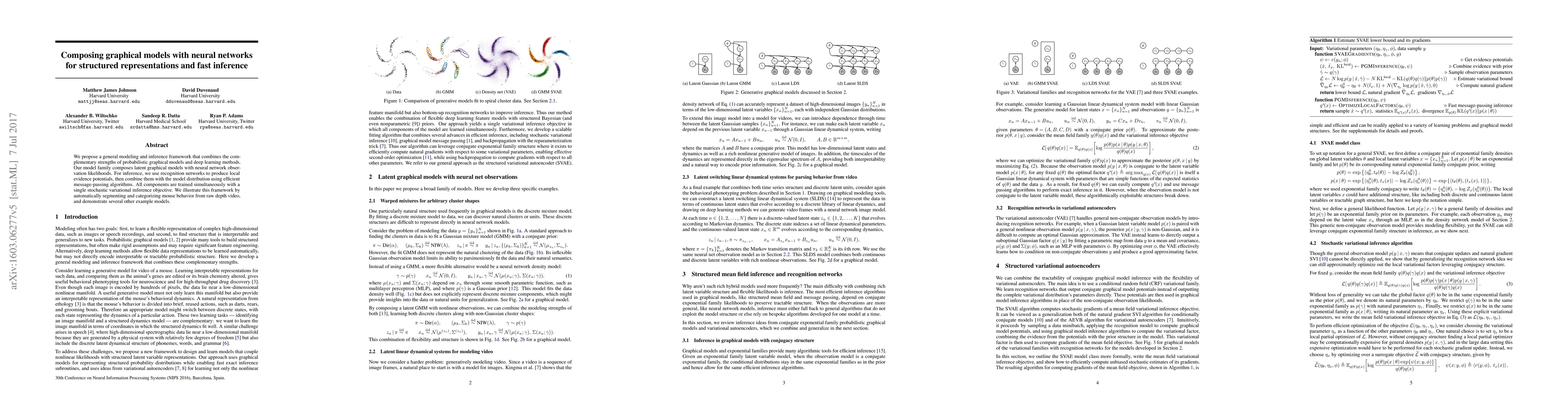 This paper introduces a framework that combines probabilistic graphical models with neural networks to enhance structured representations and enable fast inference. The proposed model uses neural networks for observation and variational autoencoders for inference, all learned together for scalability.