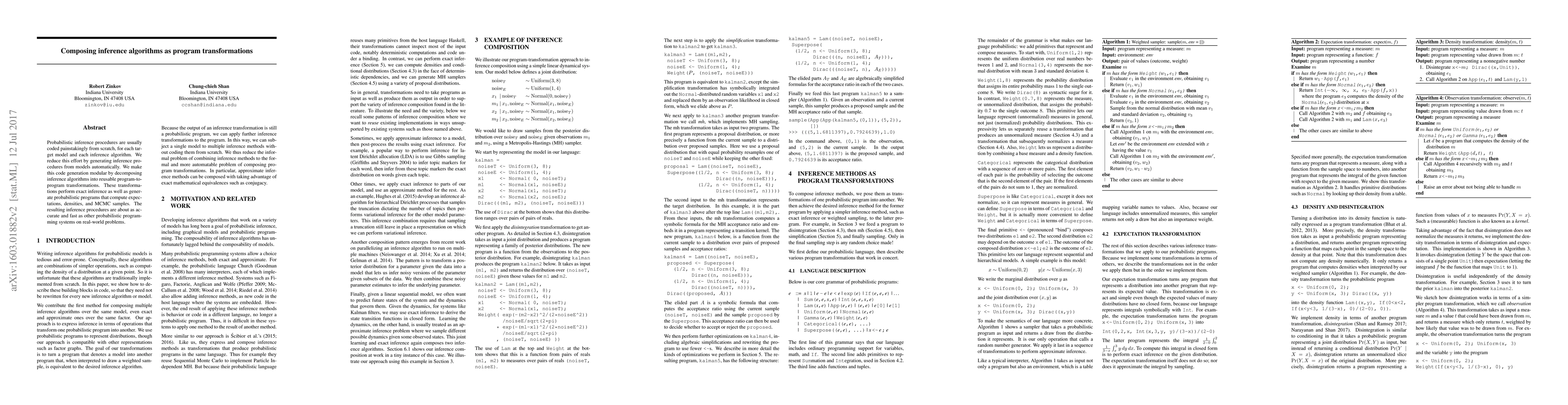Probabilistic inference procedures are usually coded painstakingly from scratch, for each target model and each inference algorithm. We reduce this effort by generating inference procedures from models automatically. We make this code generation modular by decomposing inference algorithms into reusable program-to-program transformations. These transformations perform exact inference as well as generate probabilistic programs that compute expectations, densities, and MCMC samples. The resulting inference procedures are about as accurate and fast as other probabilistic programming systems on real-world problems.