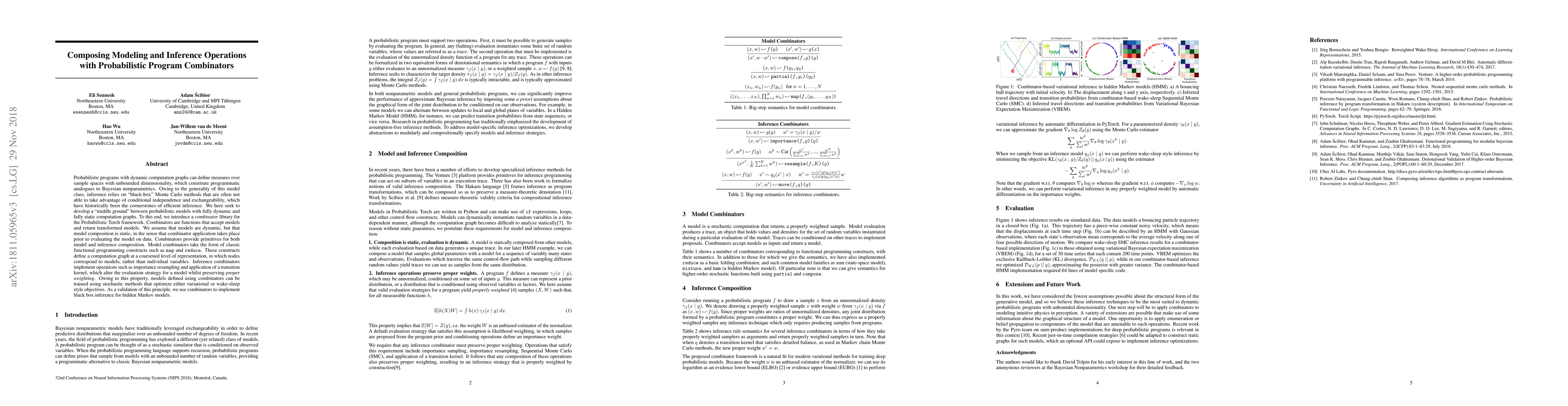 Probabilistic programs with dynamic computation graphs can define measures over sample spaces with unbounded dimensionality, which constitute programmatic analogues to Bayesian nonparametrics. Owing to the generality of this model class, inference relies on `black-box' Monte Carlo methods that are often not able to take advantage of conditional independence and exchangeability, which have historically been the cornerstones of efficient inference. We here seek to develop a `middle ground' between probabilistic models with fully dynamic and fully static computation graphs. To this end, we introduce a combinator library for the Probabilistic Torch framework. Combinators are functions that accept models and return transformed models. We assume that models are dynamic, but that model composition is static, in the sense that combinator application takes place prior to evaluating the model on data. Combinators provide primitives for both model and inference composition. Model combinators take the form of classic functional programming constructs such as map and reduce. These constructs define a computation graph at a coarsened level of representation, in which nodes correspond to models, rather than individual variables. Inference combinators implement operations such as importance resampling and application of a transition kernel, which alter the evaluation strategy for a model whilst preserving proper weighting. Owing to this property, models defined using combinators can be trained using stochastic methods that optimize either variational or wake-sleep style objectives. As a validation of this principle, we use combinators to implement black box inference for hidden Markov models.