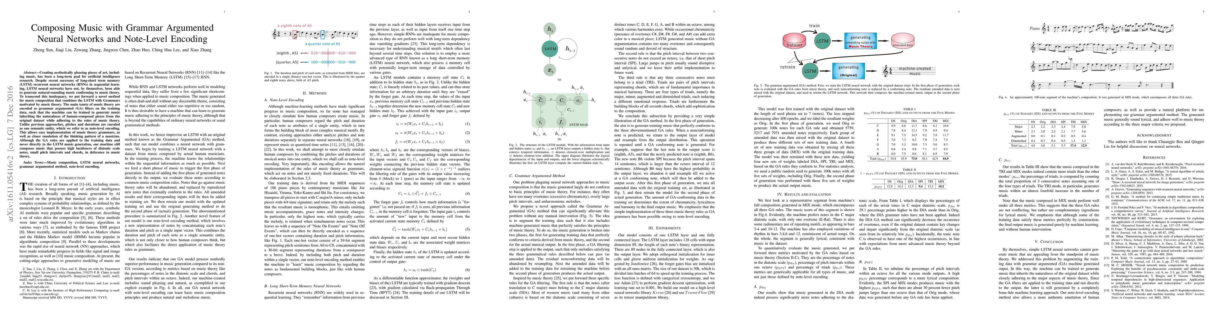 Creating aesthetically pleasing pieces of art, including music, has been a long-term goal for artificial intelligence research. Despite recent successes of long-short term memory (LSTM) recurrent neural networks (RNNs) in sequential learning, LSTM neural networks have not, by themselves, been able to generate natural-sounding music conforming to music theory. To transcend this inadequacy, we put forward a novel method for music composition that combines the LSTM with Grammars motivated by music theory. The main tenets of music theory are encoded as grammar argumented (GA) filters on the training data, such that the machine can be trained to generate music inheriting the naturalness of human-composed pieces from the original dataset while adhering to the rules of music theory. Unlike previous approaches, pitches and durations are encoded as one semantic entity, which we refer to as note-level encoding. This allows easy implementation of music theory grammars, as well as closer emulation of the thinking pattern of a musician. Although the GA rules are applied to the training data and never directly to the LSTM music generation, our machine still composes music that possess high incidences of diatonic scale notes, small pitch intervals and chords, in deference to music theory.