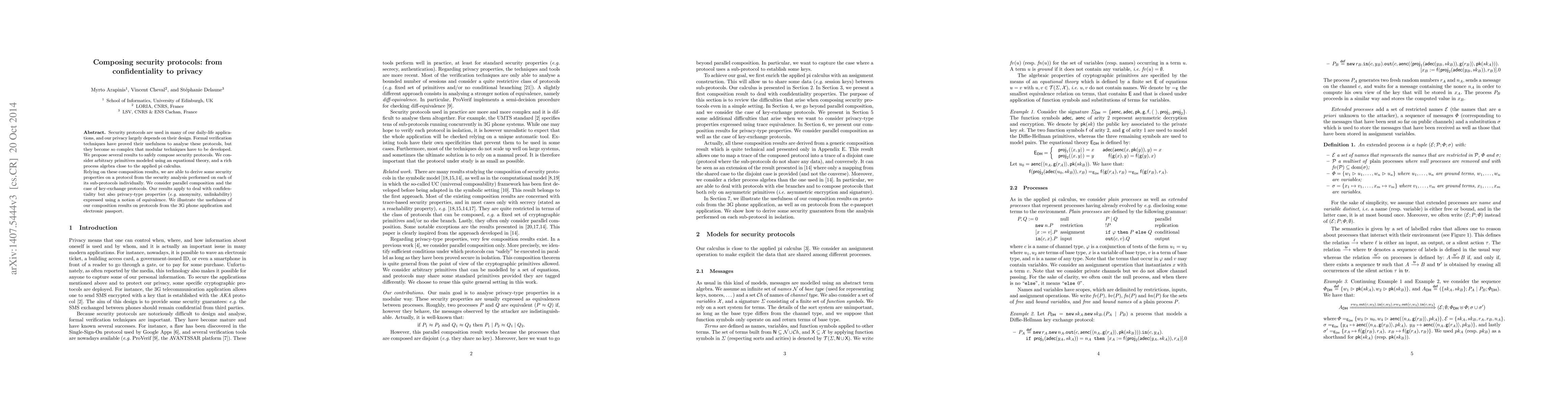 This paper proposes modular techniques for composing security protocols using formal verification, focusing on both confidentiality and privacy-type properties like anonymity and unlinkability. It demonstrates the application of these techniques through analysis of protocols used in 3G phone applications and electronic passports.
