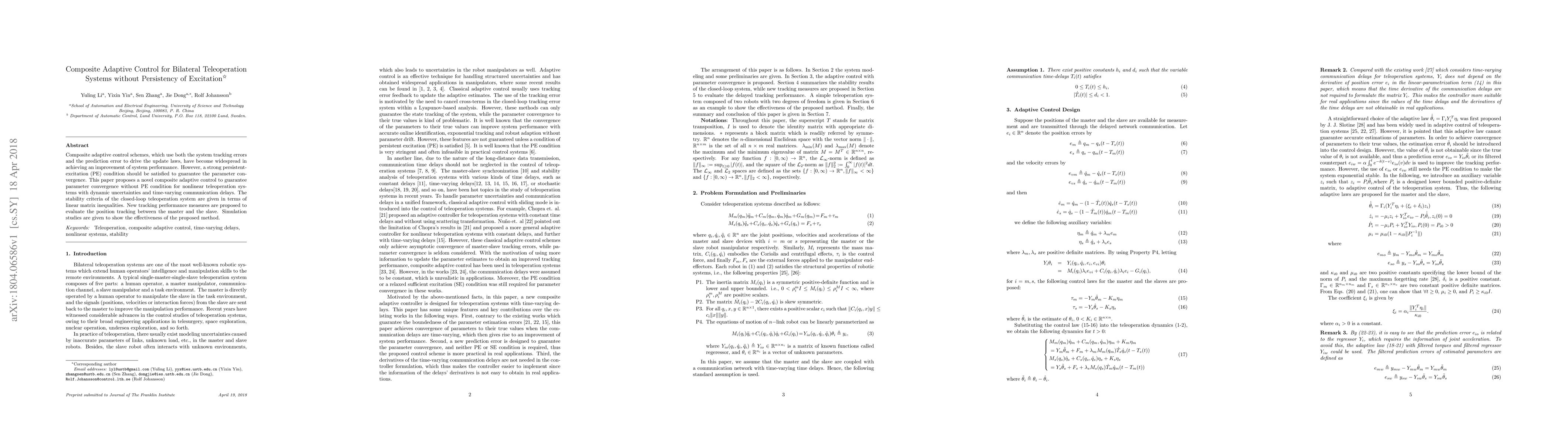 This paper proposes a novel composite adaptive control scheme for bilateral teleoperation systems that eliminates the need for the persistency of excitation condition, addressing dynamic uncertainties and time-varying delays. Stability criteria are provided using linear matrix inequalities, and simulation results demonstrate the effectiveness of the method.