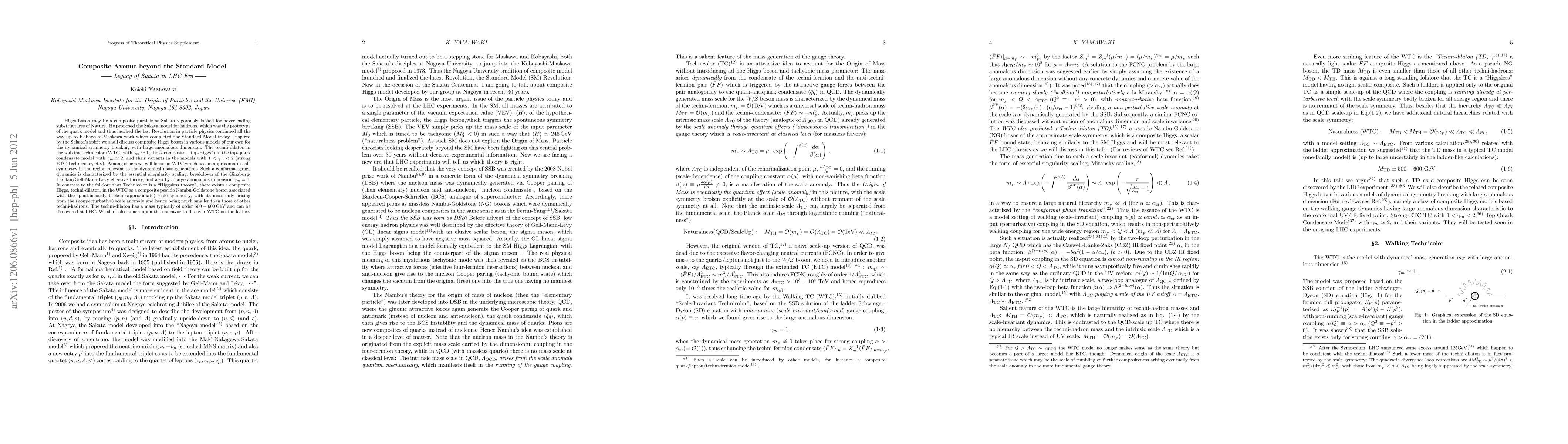 Higgs boson may be a composite particle as Sakata vigorously looked for never-ending substructures of Nature. He proposed the Sakata model for hadrons, which was the prototype of the quark model and thus lauched the last Revolution in particle physics continued all the way up to Kabayashi-Maskawa work which completed the Standard Model today. Inspired by the Sakata's spirit we shall discuss composite Higgs boson in various models of our own for the dynamical symmetry breaking with large anomalous dimension: The techni-dilaton in the walking technicolor (WTC) with $\gamma_m \simeq 1$, the $\bar t t$ composite ("top-Higgs") in the top-quark condensate model with $\gamma_m \simeq 2$, and their variants in the models with $1<\gamma_m <2$ (strong ETC Technicolor, etc.). Among others we will focus on WTC which has an approximate scale symmetry in the region relevant to the dynamical mass generation. Such a conformal gauge dynamics is characterized by the essential singularity scaling, breakdown of the Ginzburg-Landau/Gell-Mann-Levy effective theory, and also by a large anomalous dimension $\gamma_m =1$. In contrast to the folklore that Technicolor is a "Higgsless theory", there exists a composite Higgs, techni-dilaton, in the WTC as a composite pseudo Nambu-Goldstone boson associated with the spontaneously broken (approximate) scale symmetry, with its mass only arising from the (nonperturbative) scale anomaly and hence being much smaller than those of other techni-hadrons. The techni-dilaton has a mass typically of order $500-600 {\rm GeV}$ and can be discovered at LHC. We shall also touch upon the endeavor to discover WTC on the lattice.