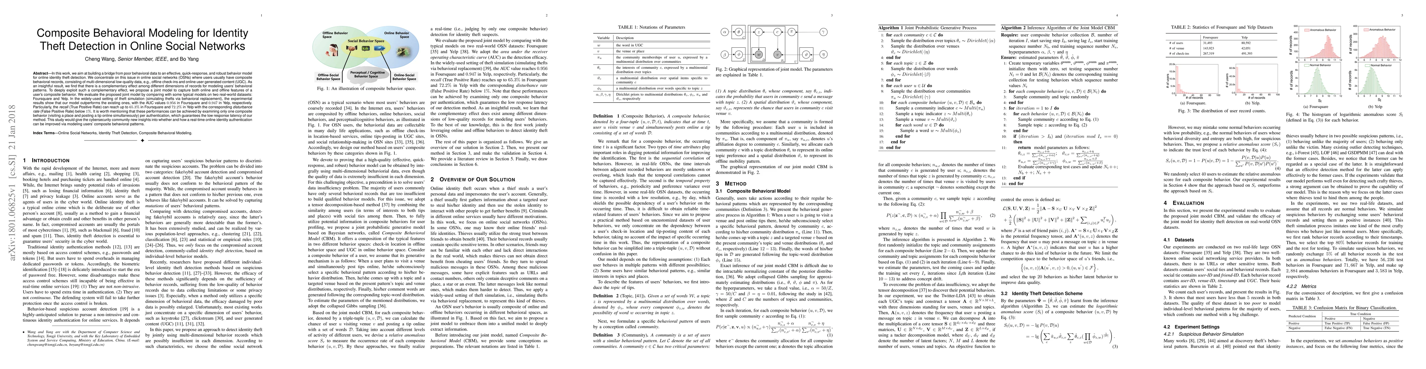 This paper proposes a composite behavioral modeling approach to detect identity theft in online social networks using both offline and online user data. The joint model effectively captures the complementary effects of different behavioral dimensions, achieving high accuracy and low false positive rates with minimal response latency, outperforming existing models on real-world datasets.