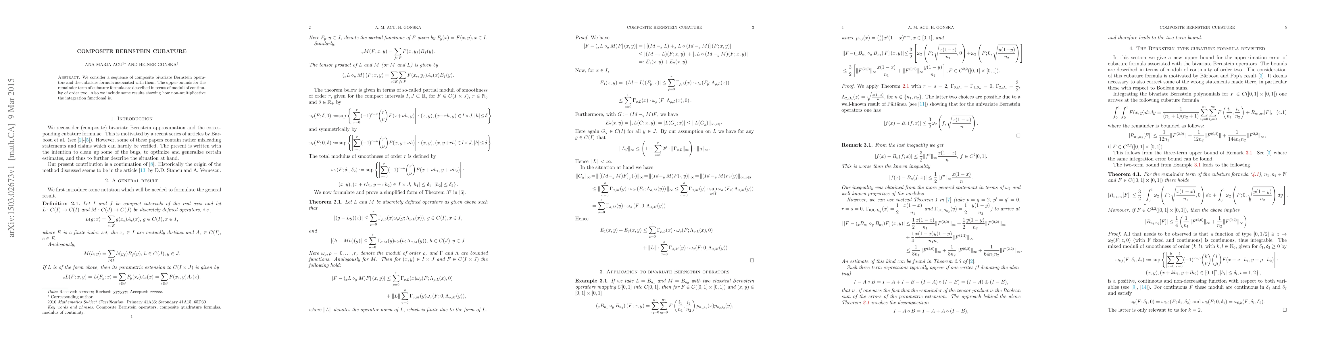 Summary: This paper investigates composite bivariate Bernstein operators and their associated cubature formulas, providing upper bounds for the remainder term in terms of second-order moduli of continuity, and demonstrating the non-multiplicative nature of the integration functional.
