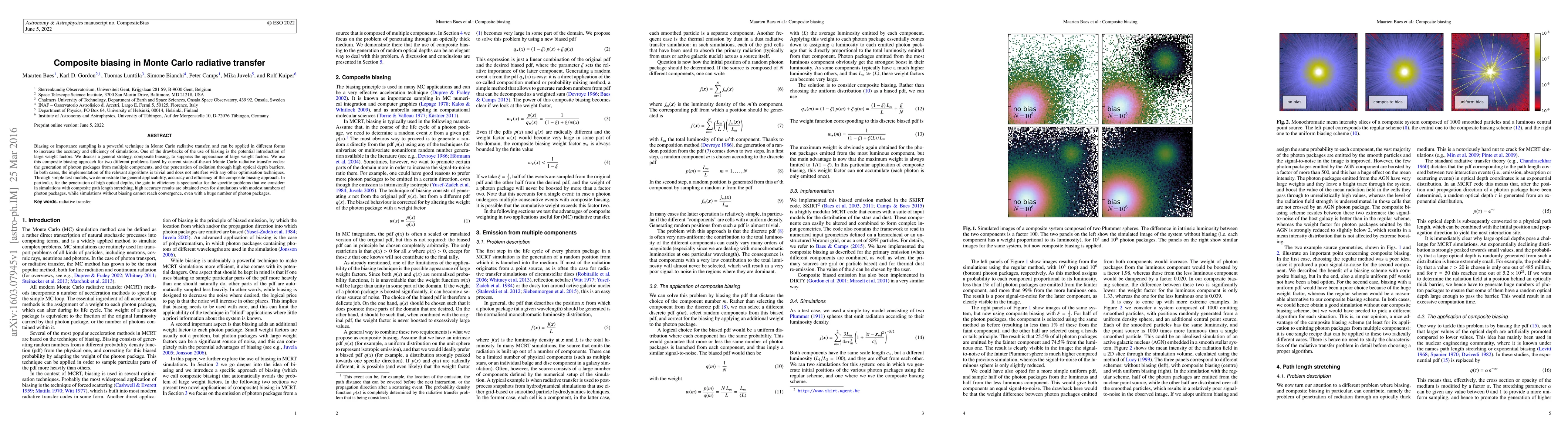 The research introduces composite biasing, a strategy to suppress large weight factors in Monte Carlo radiative transfer simulations, applicable to generating photon packages from multiple components and penetration through high optical depth barriers.