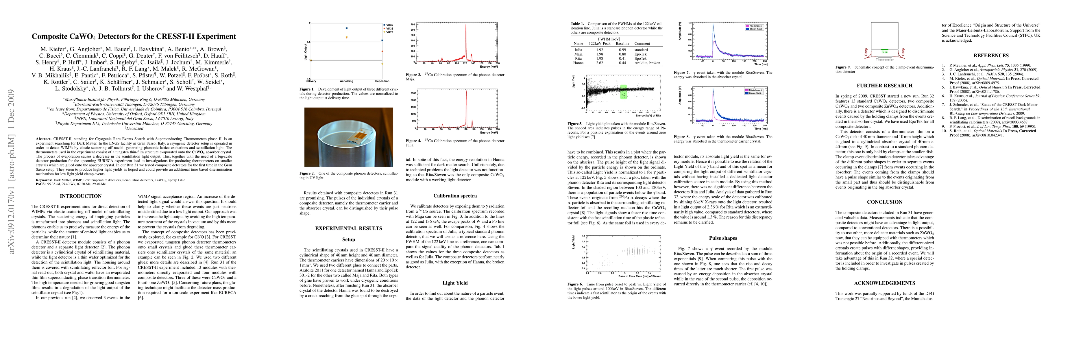 CRESST-II, standing for Cryogenic Rare Events Search with Superconducting Thermometers phase II, is an experiment searching for Dark Matter. In the LNGS facility in Gran Sasso, Italy, a cryogenic detector setup is operated in order to detect WIMPs by elastic scattering off nuclei, generating phononic lattice excitations and scintillation light. The thermometers used in the experiment consist of a tungsten thin-film structure evaporated onto the CaWO4 absorber crystal. The process of evaporation causes a decrease in the scintillation light output. This, together with the need of a big-scale detector production for the upcoming EURECA experiment lead to investigations for producing thermometers on smaller crystals which are glued onto the absorber crystal. In our Run 31 we tested composite detectors for the first time in the Gran Sasso setup. They seem to produce higher light yields as hoped and could provide an additional time based discrimination mechanism for low light yield clamp events.