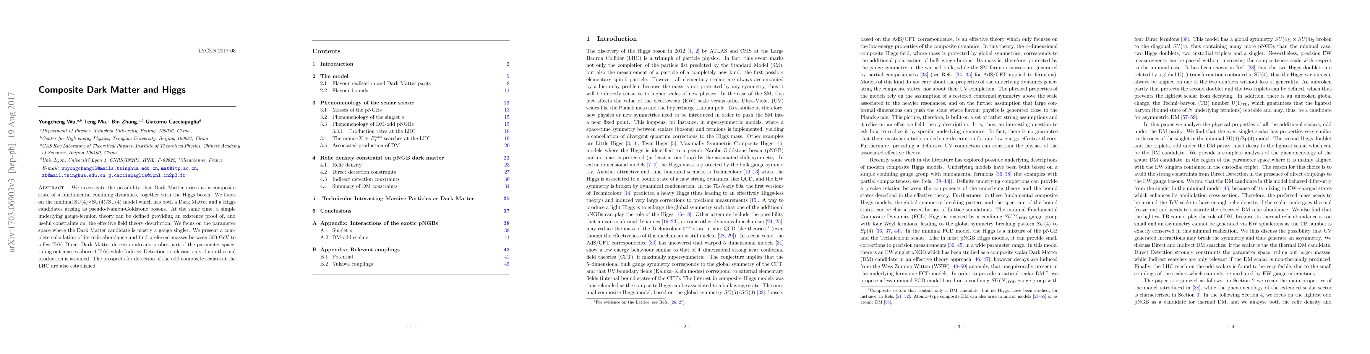 This paper explores the SU(4)×SU(4)/SU(4) model where Dark Matter and Higgs bosons emerge as composite pseudo-Nambu-Goldstone bosons, with preferred Dark Matter masses between 500 GeV to a few TeV. The study also discusses the prospects for detecting these particles at the LHC and the implications for direct and indirect Dark Matter detection.