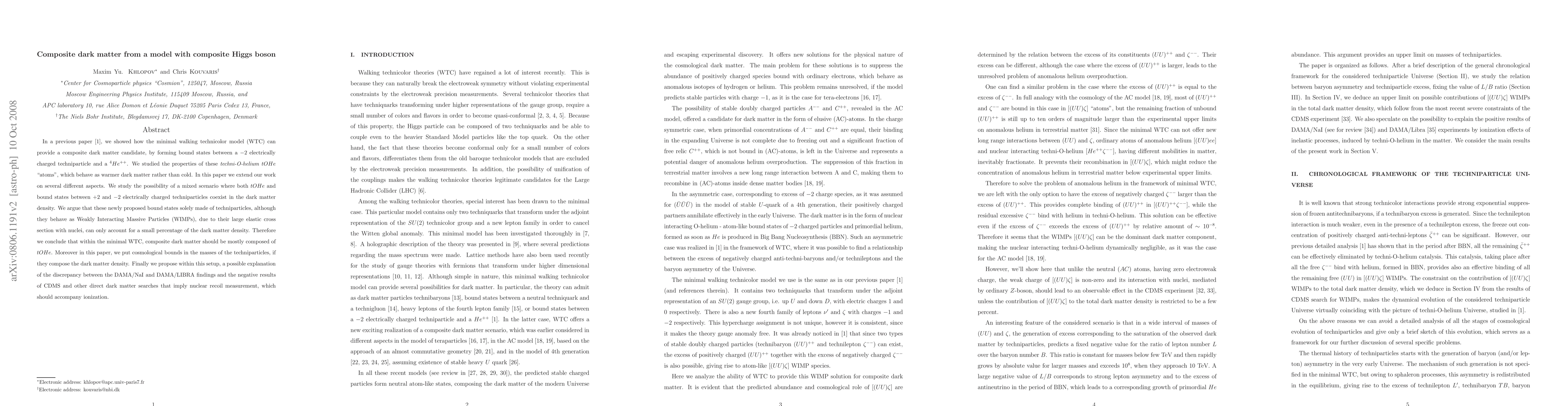In a previous paper \cite{Khlopov:2007ic}, we showed how the minimal walking technicolor model (WTC) can provide a composite dark matter candidate, by forming bound states between a -2 electrically charged techniparticle and a $^4He^{++}$. We studied the properties of these \emph{techni-O-helium} $tOHe$ "atoms", which behave as warmer dark matter rather than cold. In this paper we extend our work on several different aspects. We study the possibility of a mixed scenario where both $tOHe$ and bound states between +2 and -2 electrically charged techniparticles coexist in the dark matter density. We argue that these newly proposed bound states solely made of techniparticles, although they behave as Weakly Interacting Massive Particles (WIMPs), due to their large elastic cross section with nuclei, can only account for a small percentage of the dark matter density. Therefore we conclude that within the minimal WTC, composite dark matter should be mostly composed of $tOHe$. Moreover in this paper, we put cosmological bounds in the masses of the techniparticles, if they compose the dark matter density. Finally we propose within this setup, a possible explanation of the discrepancy between the DAMA/NaI and DAMA/LIBRA findings and the negative results of CDMS and other direct dark matter searches that imply nuclear recoil measurement, which should accompany ionization.