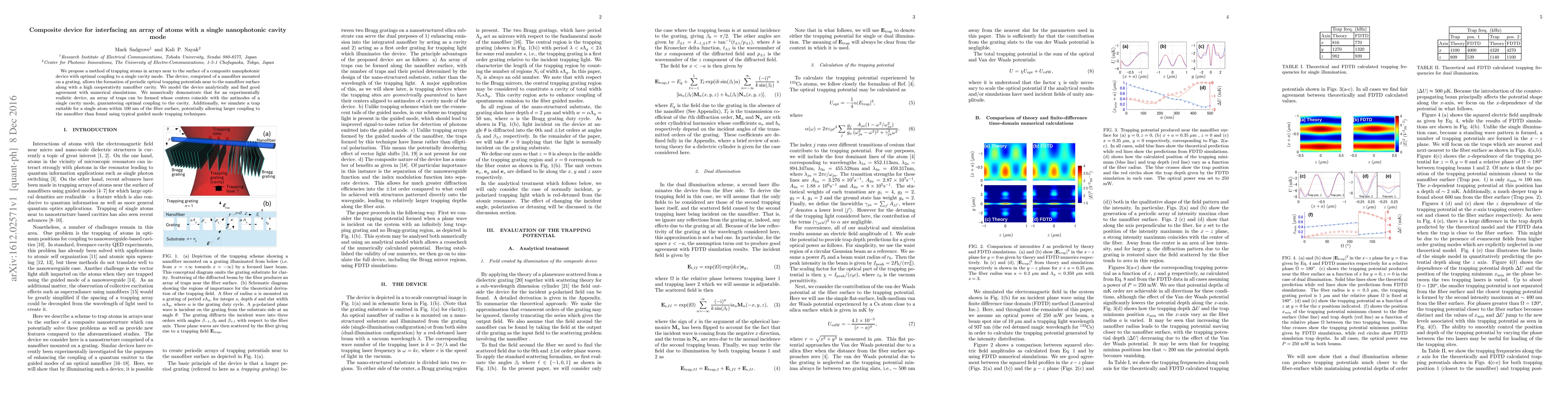 This paper proposes a composite nanophotonic device combining a nanofiber and grating to trap atoms in arrays near its surface, optimizing coupling to a single cavity mode. The device's design allows for periodic optical trapping potentials and high cooperativity, with numerical simulations showing potential for larger coupling compared to traditional methods.
