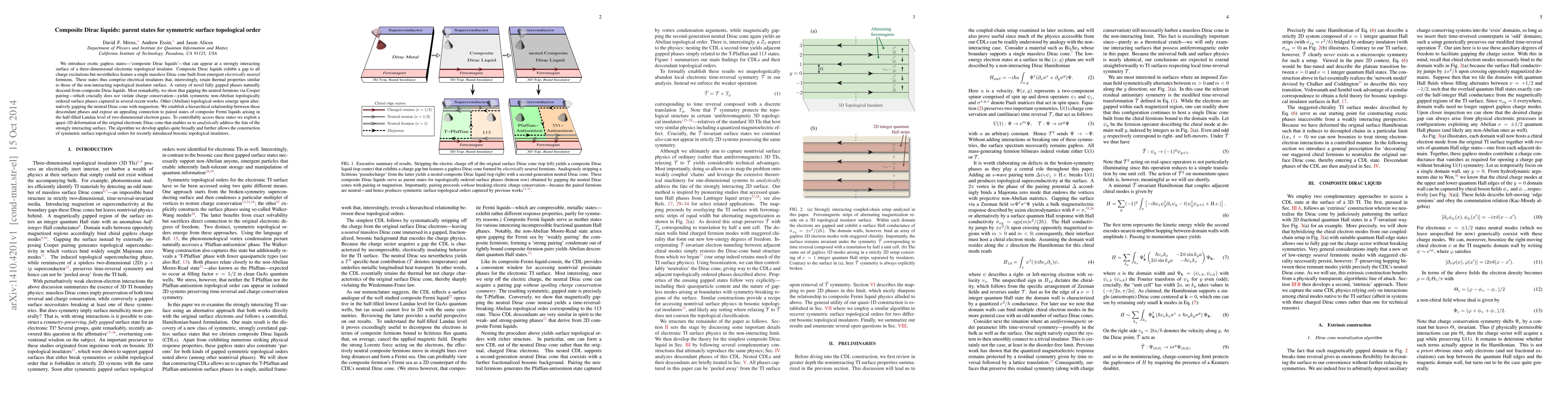 This paper introduces composite Dirac liquids, gapless states at the surface of a 3D topological insulator, characterized by a single massless Dirac cone from neutral fermions. These states can evolve into various topologically ordered phases, including non-Abelian orders via Cooper pairing, and Abelian orders through magnetism, revealing a connection to composite Fermi liquids.