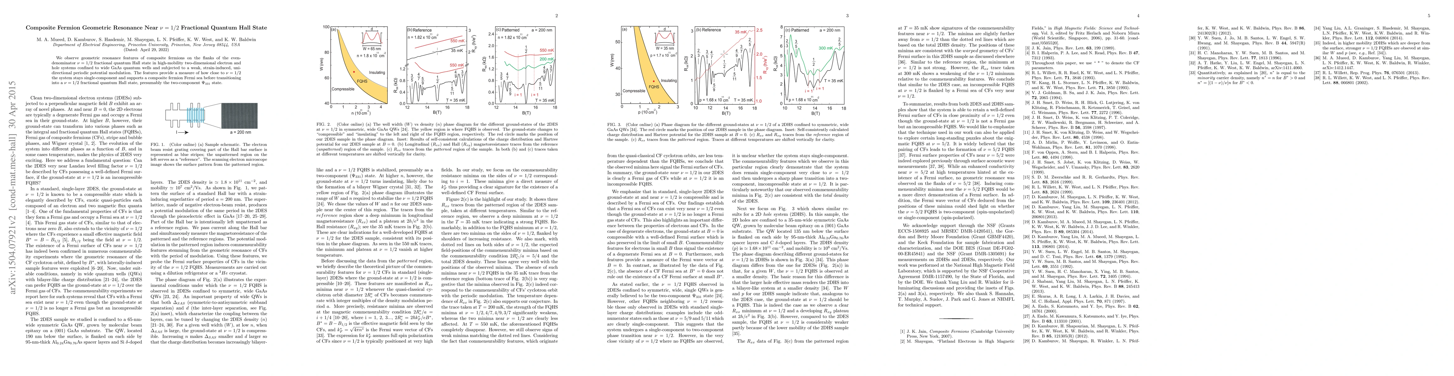 Summary: The study observes geometric resonance of composite fermions near the ν = 1/2 fractional quantum Hall state in GaAs quantum wells under strain modulation, indicating the system's single-component behavior and transition to the ν = 1/2 state, likely the Ψ331 state.