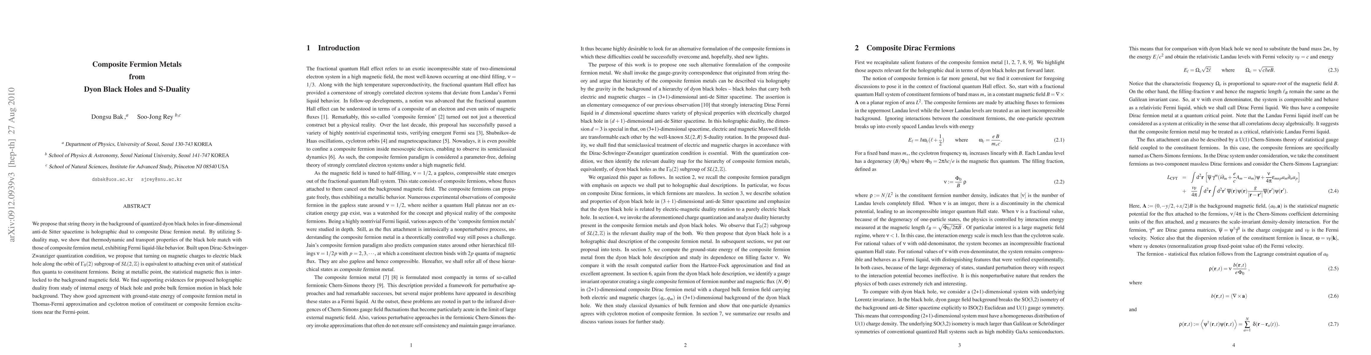 This paper proposes a holographic duality between string theory in dyon black hole backgrounds and composite Dirac fermion metals, demonstrating that thermodynamic and transport properties align, and uses S-duality to show the equivalence of magnetic charges to statistical flux quanta in fermions. Evidence for this duality is found in the agreement between black hole internal energy and fermion metal ground-state energy.