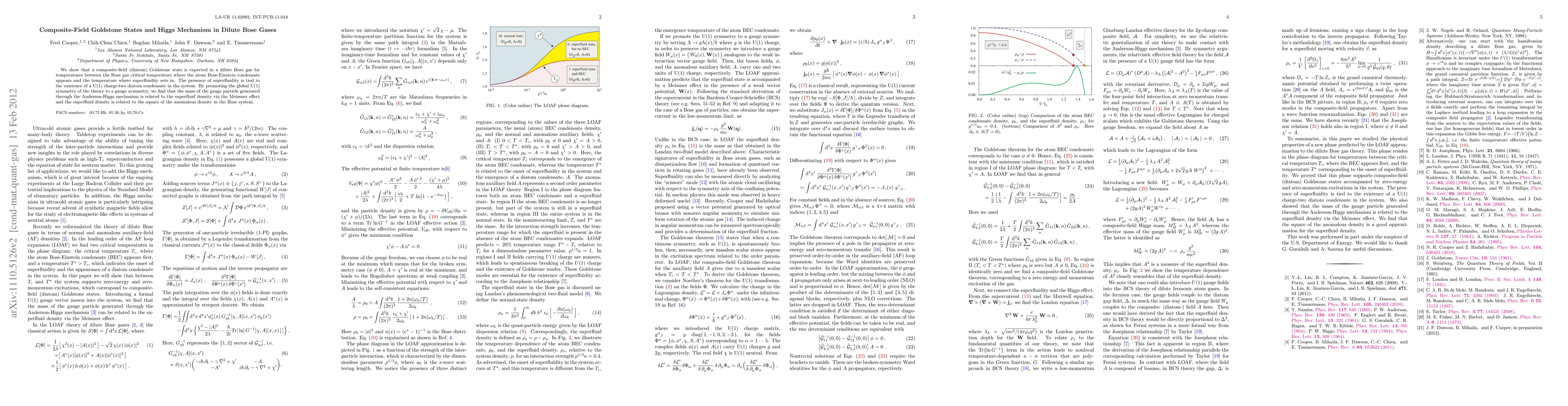 This paper demonstrates that a composite-field Goldstone state emerges in a dilute Bose gas between the critical temperature for atom condensation and the onset of superfluidity. The study links superfluidity to a U(1) charge-two diatom condensate and shows that the Higgs mechanism generates a gauge particle mass related to the superfluid density via the Meissner effect.