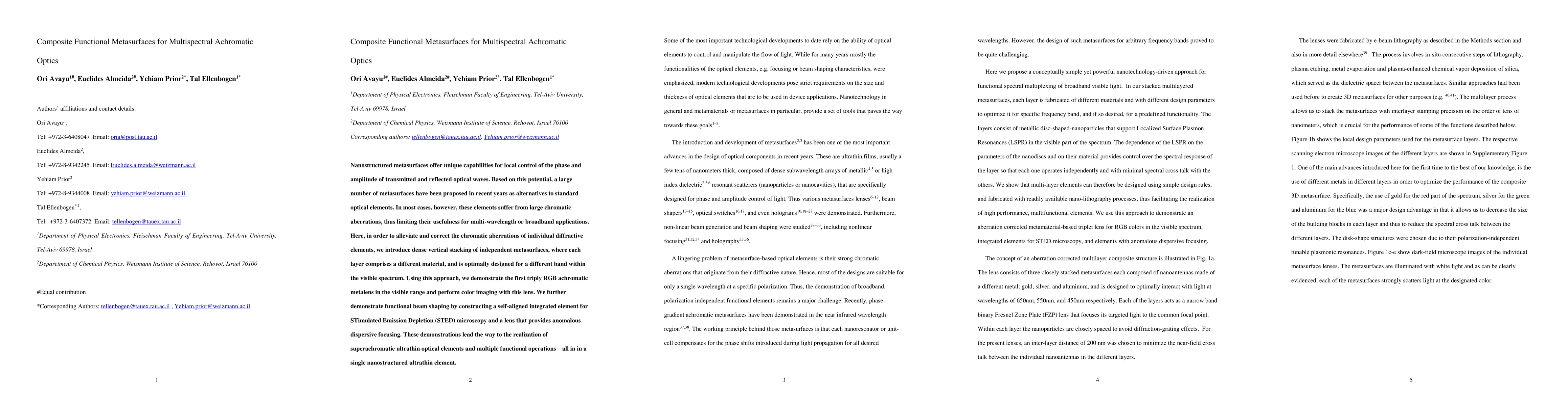 This paper introduces composite functional metasurfaces that correct chromatic aberrations through vertical stacking of different material layers, each designed for a specific spectral band. The result is a triply RGB achromatic metalens enabling multispectral color imaging and functional beam shaping for advanced microscopy and dispersive focusing.
