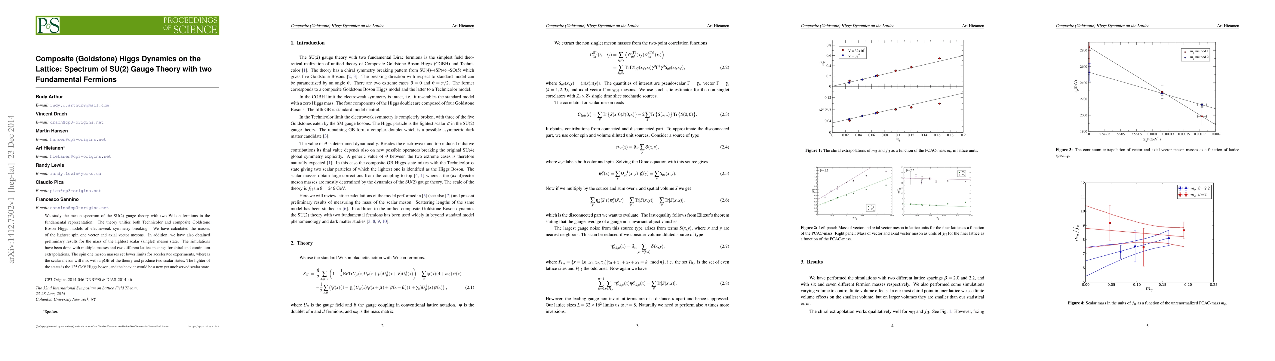 We study the meson spectrum of the SU(2) gauge theory with two Wilson fermions in the fundamental representation. The theory unifies both Technicolor and composite Goldstone Boson Higgs models of electroweak symmetry breaking. We have calculated the masses of the lightest spin one vector and axial vector mesons. In addition, we have also obtained preliminary results for the mass of the lightest scalar (singlet) meson state. The simulations have been done with multiple masses and two different lattice spacings for chiral and continuum extrapolations. The spin one meson masses set lower limits for accelerator experiments, whereas the scalar meson will mix with a pGB of the theory and produce two scalar states. The lighter of the states is the 125 GeV Higgs boson, and the heavier would be a new yet unobserved scalar state.