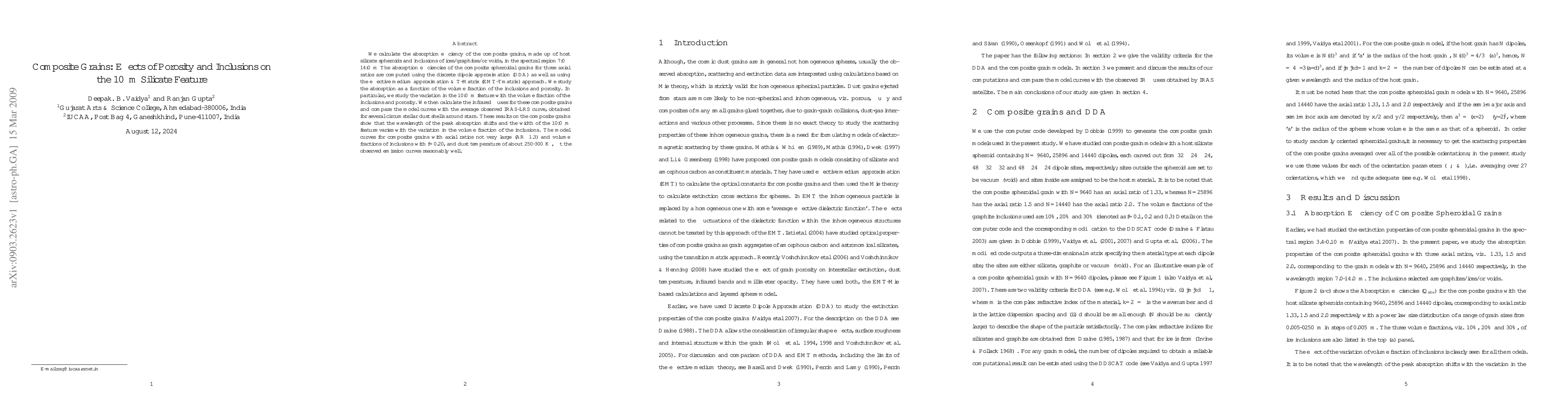 We calculate the absorption efficiency of the composite grains, made up of host silicate spheroids and inclusions of ices/graphites/or voids, in the spectral region $7.0-14.0\mu$m The absorption efficiencies of the composite spheroidal grains for three axial ratios are computed using the discrete dipole approximation (DDA) as well as using the effective medium approximation & T-Matrix (EMT-Tmatrix) ap proach. We study the absorption as a function of the volume fraction of the inclusions and porosity. In particular, we study the variation in the $10.0\mu$m feature with the volume fraction of the inclusions and porosity. We then calculate the infrared fluxes for these composite grains and compare the model curves with the average observed IRAS-LRS curve, obtained for several circumstellar dust shells around stars. These results on the composite grains show that the wavelength of the peak absorption shifts and the width of the $10.0\mu$m feature varies with the variation in the volume fraction of the inclusions. The model curves for composite grains with axial ratios not very large (AR$\sim$1.3) and volume fractions of inclusions with f=0.20, and dust temperature of about 250-300$^{\circ}$K, fit the observed emission curves reasonably well.