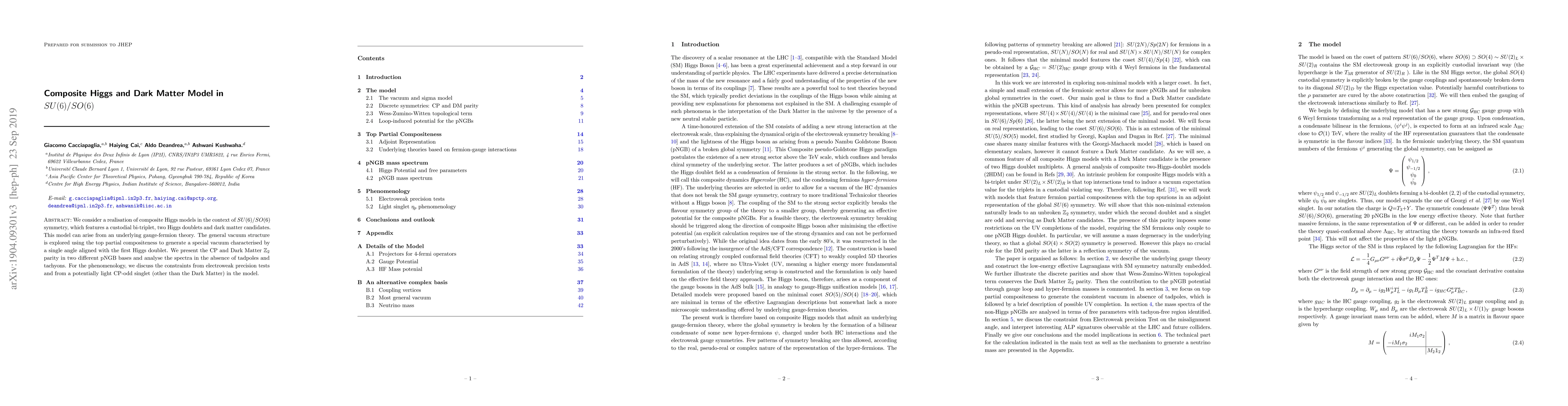 This research proposes a composite Higgs model based on SU(6)/SO(6) symmetry, featuring a custodial bi-triplet, two Higgs doublets, and dark matter candidates. It explores the model's vacuum structure, spectra, and phenomenology, discussing constraints from electroweak precision tests and a potentially light CP-odd singlet.