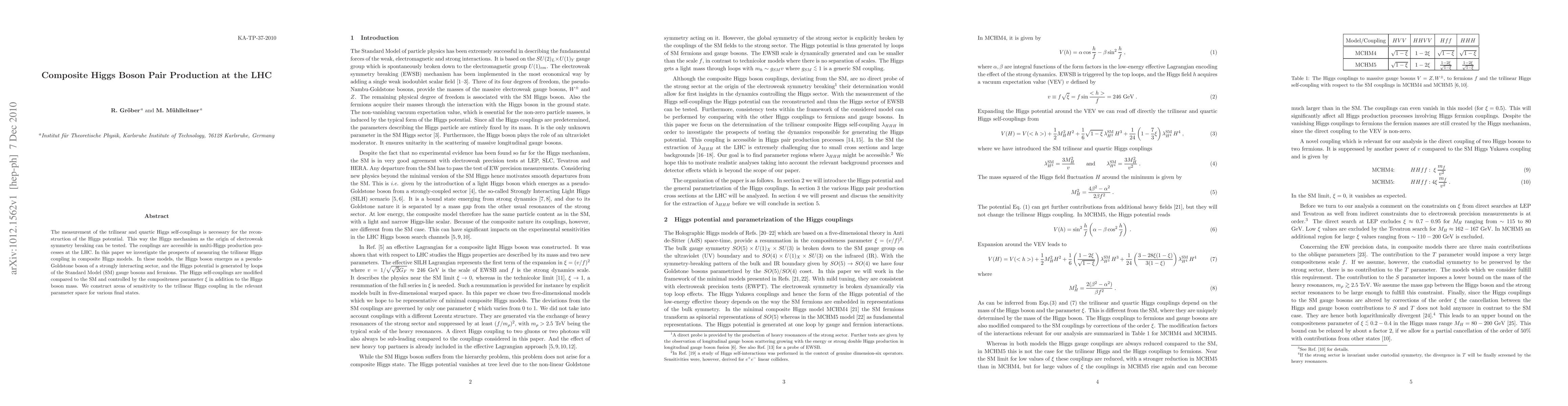 This paper explores the prospects of measuring the trilinear Higgs coupling in composite Higgs models at the LHC, where the Higgs emerges as a pseudo-Goldstone boson. It identifies areas of sensitivity to these couplings in the parameter space, highlighting modifications compared to the Standard Model.