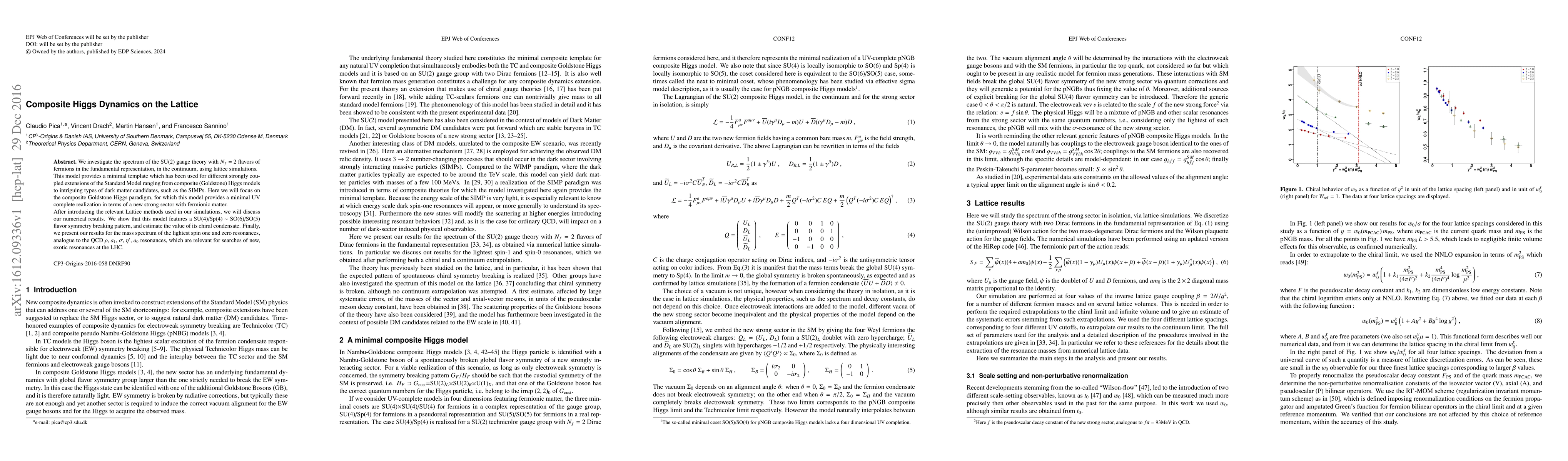 We investigate the spectrum of the SU(2) gauge theory with $N_f$ = 2 flavors of fermions in the fundamental representation, in the continuum, using lattice simulations. This model provides a minimal template which has been used for different strongly coupled extensions of the Standard Model ranging from composite (Goldstone) Higgs models to intriguing types of dark matter candidates, such as the SIMPs. Here we will focus on the composite Goldstone Higgs paradigm, for which this model provides a minimal UV complete realization in terms of a new strong sector with fermionic matter. After introducing the relevant Lattice methods used in our simulations, we will discuss our numerical results. We show that this model features a SU(4)/Sp(4) $\sim$ SO(6)/SO(5) flavor symmetry breaking pattern, and estimate the value of its chiral condensate. Finally, we present our results for the mass spectrum of the lightest spin one and zero resonances, analogue to the QCD $\rho$, $a_1$, $\sigma$, $\eta'$, $a_0$ resonances, which are relevant for searches of new, exotic resonances at the LHC.