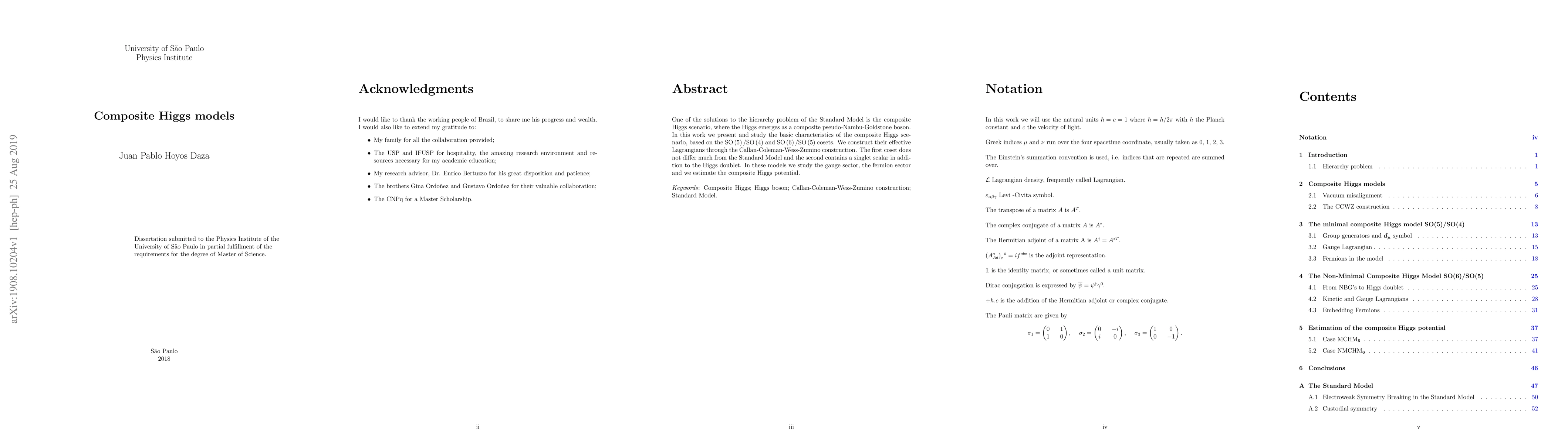 This paper explores composite Higgs models as solutions to the hierarchy problem, focusing on $SO(5)/SO(4)$ and $SO(6)/SO(5)$ cosets. It constructs their effective Lagrangians and examines the gauge and fermion sectors, concluding with an estimation of the composite Higgs potential.