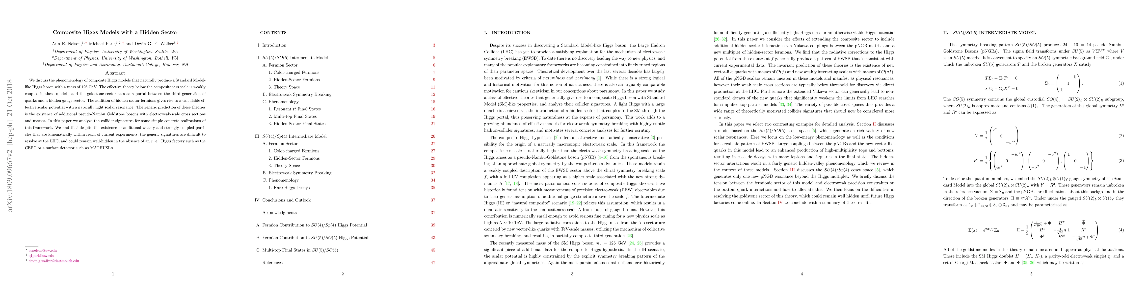 We discuss the phenomenology of composite Higgs models that naturally produce a Standard Model-like Higgs boson with a mass of $126$ GeV. The effective theory below the compositeness scale is weakly coupled in these models, and the goldstone sector acts as a portal between the third generation of quarks and a hidden gauge sector. The addition of hidden-sector fermions gives rise to a calculable effective scalar potential with a naturally light scalar resonance. The generic prediction of these theories is the existence of additional pseudo-Nambu Goldstone bosons with electroweak-scale cross sections and masses. In this paper we analyze the collider signatures for some simple concrete realizations of this framework. We find that despite the existence of additional weakly and strongly coupled particles that are kinematically within reach of current experiments, the generic signatures are difficult to resolve at the LHC, and could remain well-hidden in the absence of an $e^+ e^-$ Higgs factory such as the CEPC or a surface detector such as MATHUSLA.
