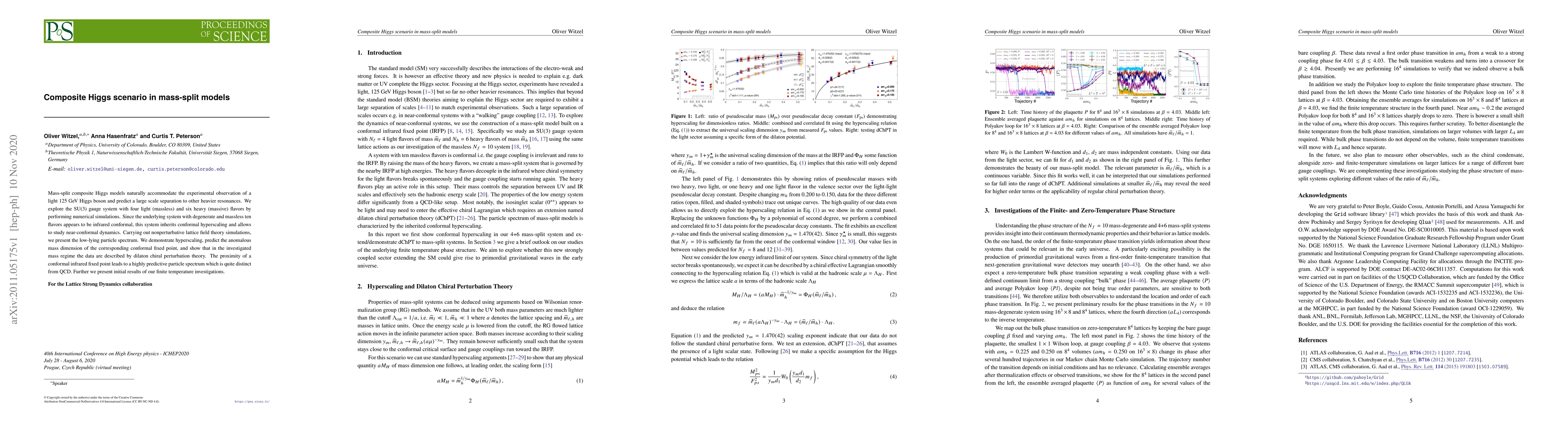 Mass-split composite Higgs models naturally accommodate the experimental observation of a light 125 GeV Higgs boson and predict a large scale separation to other heavier resonances. We explore the SU(3) gauge system with four light (massless) and six heavy (massive) flavors by performing numerical simulations. Since the underlying system with degenerate and massless ten flavors appears to be infrared conformal, this system inherits conformal hyperscaling and allows to study near-conformal dynamics. Carrying out nonperturbative lattice field theory simulations, we present the low-lying particle spectrum. We demonstrate hyperscaling, predict the anomalous mass dimension of the corresponding conformal fixed point, and show that in the investigated mass regime the data are described by dilaton chiral perturbation theory. The proximity of a conformal infrared fixed point leads to a highly predictive particle spectrum which is quite distinct from QCD. Further we present initial results of our finite temperature investigations.