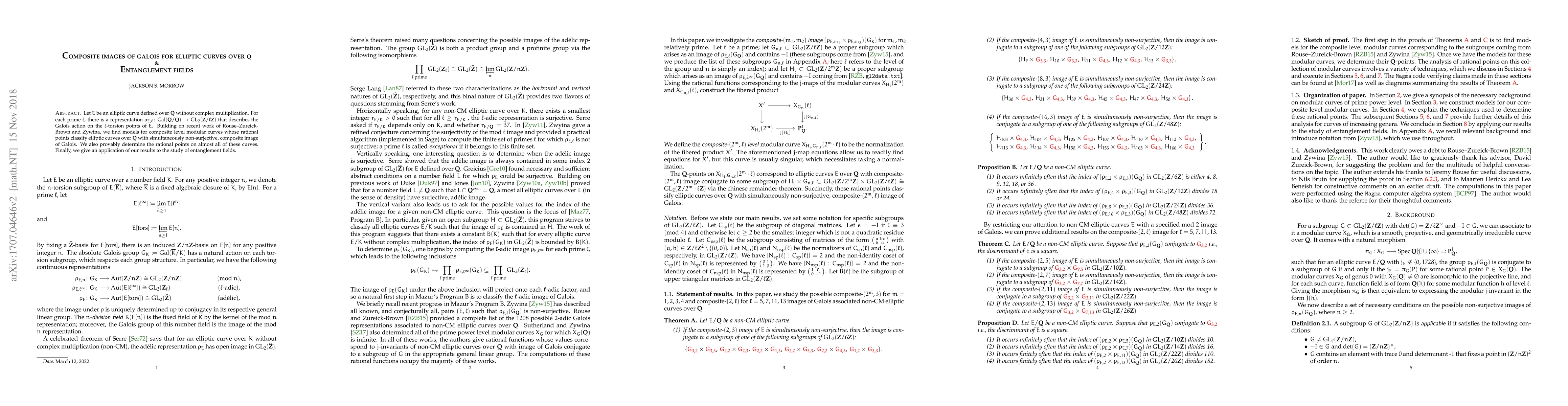 This paper investigates the Galois representations of elliptic curves over $\mathbf{Q}$ without complex multiplication, revealing models for modular curves whose rational points correspond to such curves with composite non-surjective Galois images. The authors also determine rational points on these curves and apply their findings to the study of entanglement fields.