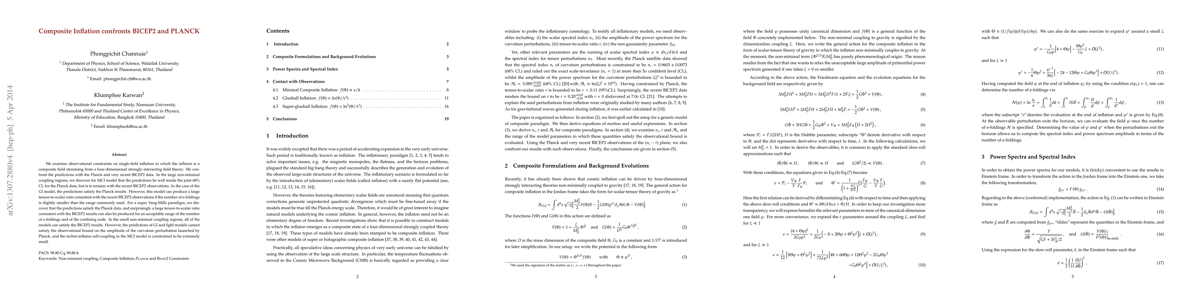 This paper investigates composite inflation models where the inflaton arises from a strongly interacting field theory, comparing their predictions against Planck and BICEP2 data. While the MCI model aligns with Planck but conflicts with BICEP2, the GI model satisfies Planck but can match BICEP2 with fewer e-foldings. The super Yang-Mills model also fits both datasets under certain conditions. Small non-minimal coupling regions allow BICEP2 compliance but face constraints from Planck's curvature perturbation data.