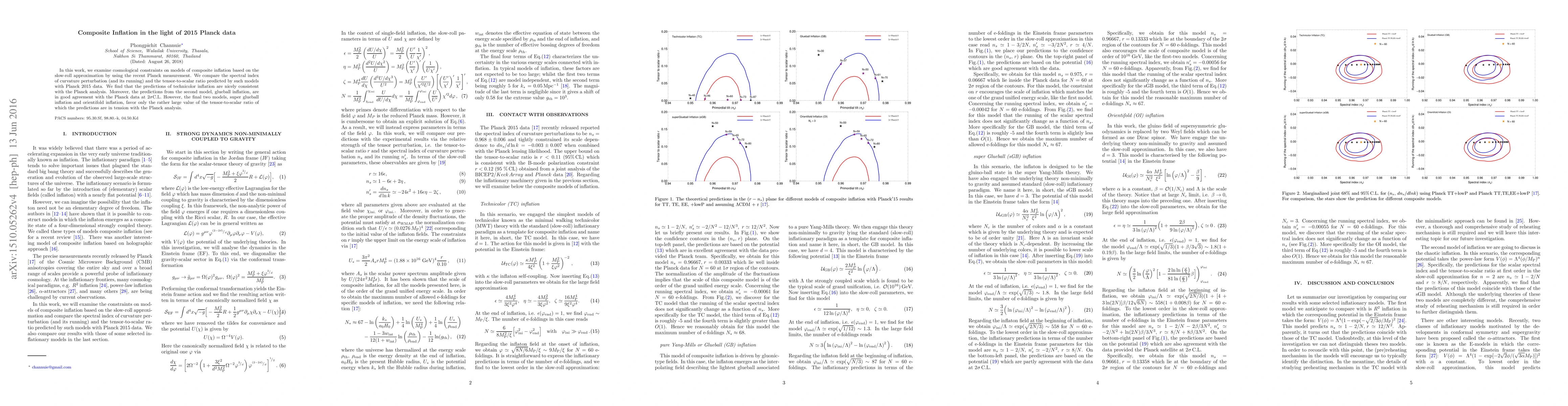 This paper evaluates composite inflation models using the 2015 Planck data, finding that technicolor inflation aligns well with the analysis, while glueball inflation agrees at $2\sigma$ confidence level. Super glueball and orientifold inflation models favor a large tensor-to-scalar ratio, conflicting with the Planck results.
