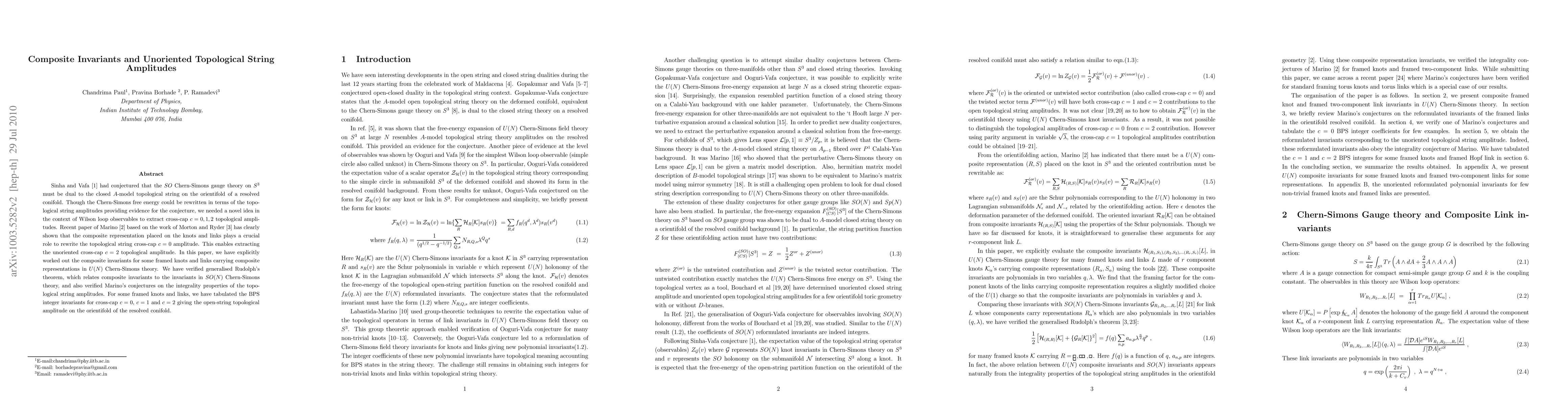 Sinha and Vafa had conjectured that the $SO$ Chern-Simons gauge theory on $S^3$ must be dual to the closed $A$-model topological string on the orientifold of a resolved conifold. Though the Chern-Simons free energy could be rewritten in terms of the topological string amplitudes providing evidence for the conjecture, we needed a novel idea in the context of Wilson loop observables to extract cross-cap $c=0,1,2$ topological amplitudes. Recent paper of Marino based on the work of Morton and Ryder has clearly shown that the composite representation placed on the knots and links plays a crucial role to rewrite the topological string cross-cap $c=0$ amplitude. This enables extracting the unoriented cross-cap $c=2$ topological amplitude. In this paper, we have explicitly worked out the composite invariants for some framed knots and links carrying composite representations in U(N) Chern-Simons theory. We have verified generalised Rudolph's theorem, which relates composite invariants to the invariants in SO(N) Chern-Simons theory, and also verified Marino's conjectures on the integrality properties of the topological string amplitudes. For some framed knots and links, we have tabulated the BPS integer invariants for cross-cap $c=0$, $c=1$ and $c=2$ giving the open-string topological amplitude on the orientifold of the resolved conifold.